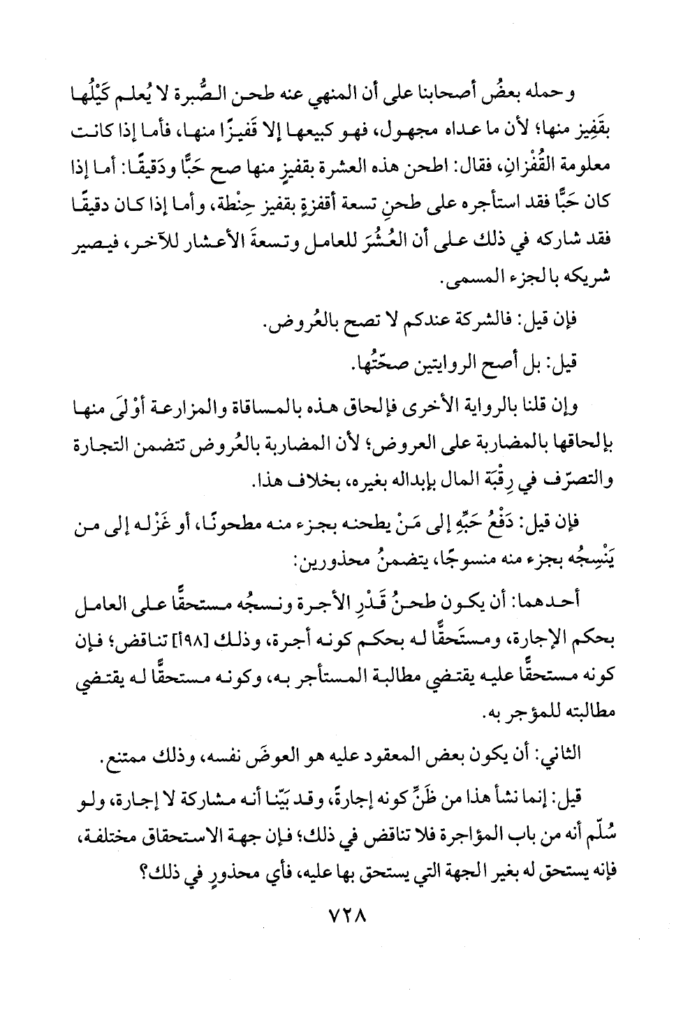 وحمله بعضُ أصحابنا على أن المنهي عنه طحن الصُّبرة لا يُعلم كَيْلُها بقَفِيز منها؛ لأن ما عداه مجهول، فهو كبيعها إلا قَفيزًا منها، فأما إذا كانت معلومة القُفْزانِ، فقال: اطحن هذه العشرة بقفيزٍ منها صح حَبًّا ودَقيقًا: أما إذا كان حَبًّا فقد استأجره على طحنِ تسعة أقفزةٍ بقفيز حِنْطة، وأما إذا كان دقيقًا فقد شاركه في ذلك على أن العُشُرَ للعامل وتسعةَ الأعشار للآخر، فيصير شريكه بالجزء المسمى.