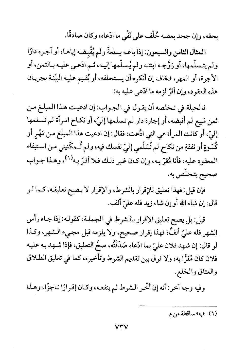 المثال الثامن والسبعون: إذا باعه سِلعةً ولم يُقْبِضه إياها، أو آجره دارًا ولم يتسلّمها، أو زوَّجه ابنته ولم يُسلّمها إليه، ثم ادّعى عليه بالثمن، أو الأجرة، أو المهر، فخاف إن أنكره أن يستحلفه، أو يُقيم عليه البيّنة بجريان هذه العقود، وإن أقرّ لزمه ما ادّعى عليه به: