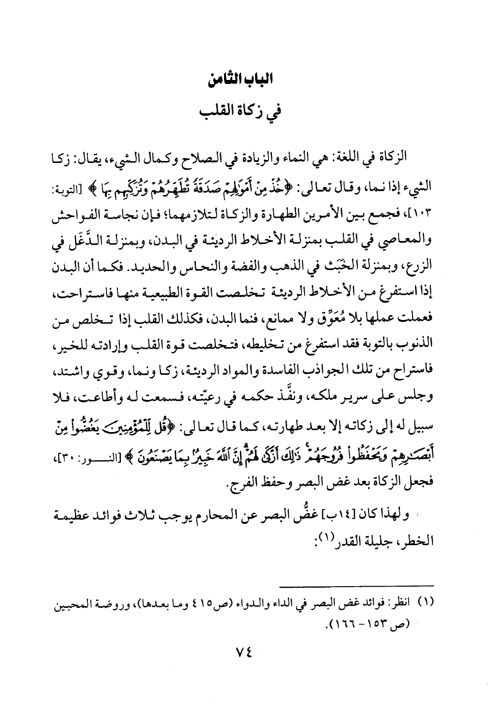 الزكاة في اللغة: هي النماء والزيادة في الصلاح وكمال الشيء، يقال: زكا الشيء إذا نما، وقال تعالى: {خُذْ مِنْ أَمْوَالِهِمْ صَدَقَةً تُطَهِّرُهُمْ وَتُزَكِّيهِمْ بِهَا} [التوبة: 103]، فجمع بين الأمرين الطهارة والزكاة لتلازمهما؛ فإن نجاسة الفواحش والمعاصي في القلب بمنزلة الأخلاط الرديئة في البدن، وبمنزلة الدَّغَل في الزرع، وبمنزلة الخَبَث في الذهب والفضة والنحاس والحديد. فكما أن البدن إذا استفرغ من الأخلاط الرديئة تخلصت القوة الطبيعية منها فاستراحت، فعملت عملها بلا مُعَوِّق ولا ممانع، فنما البدن، فكذلك القلب إذا تخلص من الذنوب بالتوبة فقد استفرغ من تخليطه، فتخلصت قوة القلب وإرادته للخير، فاستراح من تلك الجواذب الفاسدة والمواد الرديئة، زكا ونما، وقوي واشتد، وجلس على سرير ملكه، ونفَّذ حكمه في رعيّته، فسمعت له وأطاعت، فلا سبيل له إلى زكاته إلا بعد طهارته، كما قال تعالى: {قُلْ لِلْمُؤْمِنِينَ يَغُضُّوا مِنْ أَبْصَارِهِمْ وَيَحْفَظُوا فُرُوجَهُمْ ذَلِكَ أَزْكَى لَهُمْ إِنَّ اللَّهَ خَبِيرٌ بِمَا يَصْنَعُونَ} [النور: 30]، فجعل الزكاة بعد غض البصر وحفظ الفرج.