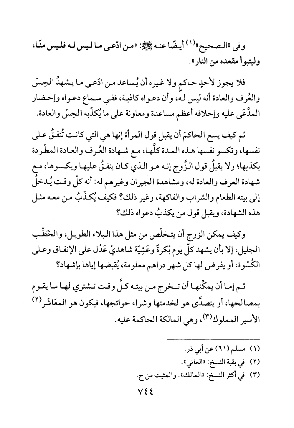 وكيف يمكن الزوج أن يتخلّص من مثل هذا النبلاء الطويل، والخَطْب الجليل، إلا بأن يشهد كلّ يوم بُكرةً وعَشِيّة شاهديْ عَدْل على الإنفاق وعلى الكُسْوة، أو يفرض لها كل شهر دراهم معلومة، يُقبضها إياها بإشهاد؟