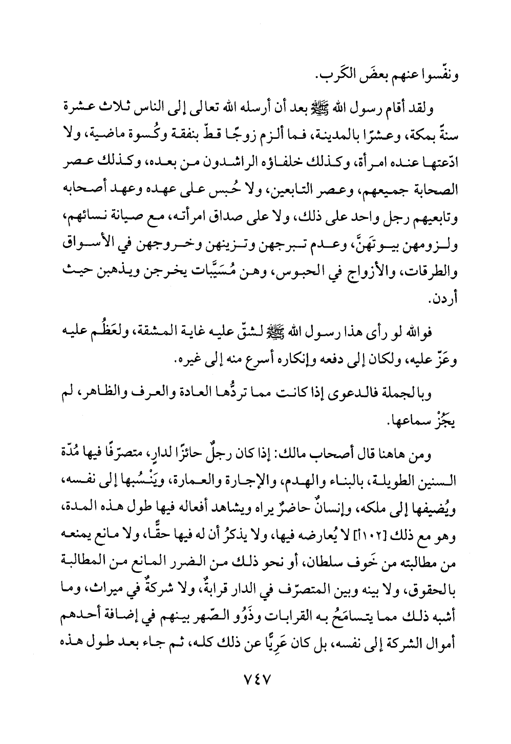 ولقد أقام رسول الله - صلى الله عليه وسلم - بعد أن أرسله الله تعالى إلى الناس ثلاث عشرة سنةً بمكة، وعشرًا بالمدينة، فما ألزم زوجًا قطّ بنفقة وكُسوة ماضية، ولا ادّعتها عنده امرأة، وكذلك خلفاؤه الراشدون من بعده، وكذلك عصر الصحابة جميعهم، وعصر التابعين، ولا حُبس على عهده وعهد أصحابه وتابعيهم رجل واحد على ذلك، ولا على صداق امرأته، مع صيانة نسائهم، ولزومهن بيوتَهنَّ، وعدم تبرجهن وتزينهن وخروجهن في الأسواق والطرقات، والأزواج في الحبوس، وهن مُسَيَّبات يخرجن ويذهبن حيث أردن.