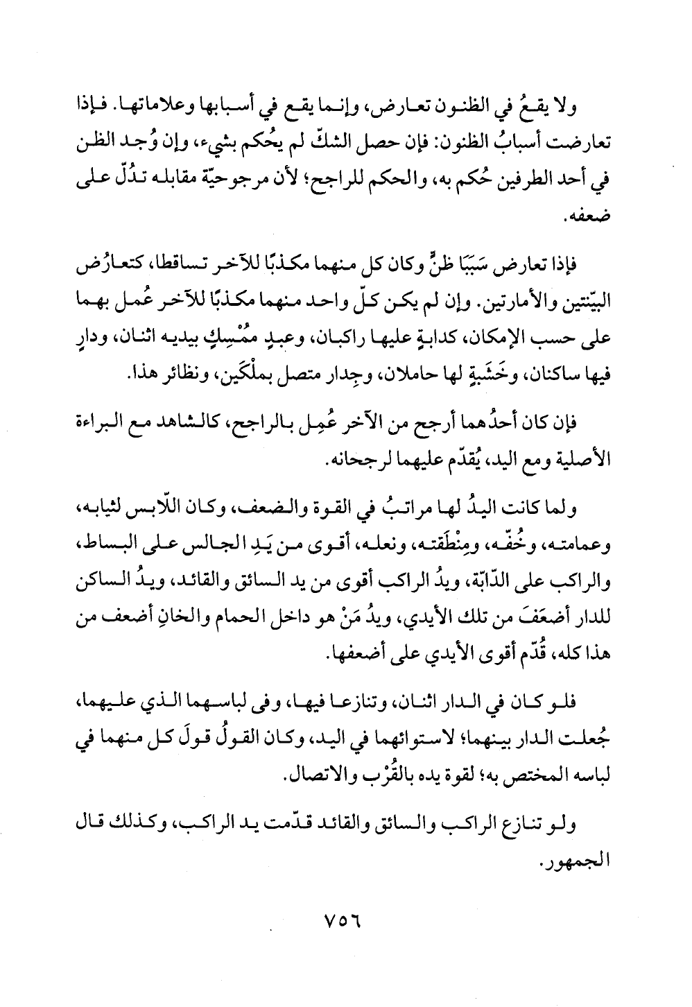ولما كانت اليدُ لها مراتبُ في القوة والضعف، وكان اللّابس لثيابه، وعمامته، وخُفّه، ومِنْطَقته، ونعله، أقوى من يَدِ الجالس على البساط، والراكب على الدّابّة، ويدُ الراكب أقوى من يد السائق والقائد، ويدُ الساكن للدار أضعَفَ من تلك الأيدي، ويدُ مَنْ هو داخل الحمام والخانِ أضعف من هذا كلُّه، قُدّم أقوى الأيدي على أضعفها.