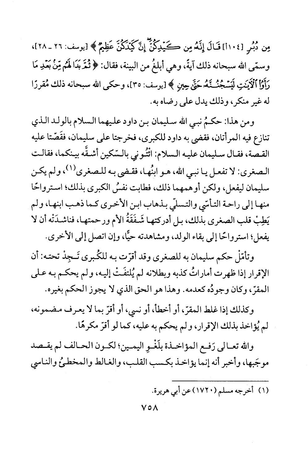 وتأمّلْ حكم سليمان به للصغرى وقد أقرّت به للكُبرى تَجِدْ تحته: أن الإقرار إذا ظهرت أماراتُ كذبه وبطلانه لم يُلتفَتْ إليه، ولم يحكم به على المقرّ، وكان وجودُه كعدمه. وهذا هو الحق الذي لا يجوز الحكم بغيره.