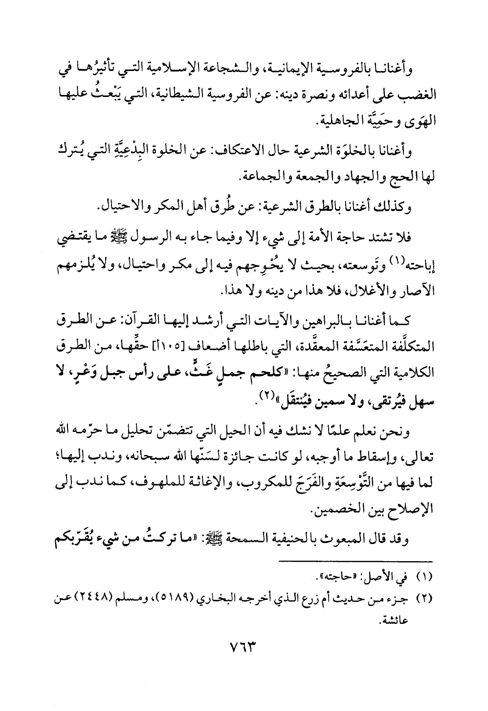 فلا تشتد حاجة الأمة إلى شيء إلا وفيما جاء به الرسول - صلى الله عليه وسلم - يقتضي إباحته (¬1) وتَوسعته، بحيث لا يحوِجهم فيه إلى مكر واحتيال، ولا يُلزمهم الآصار والأغلال، فلا هذا من دينه ولا هذا.