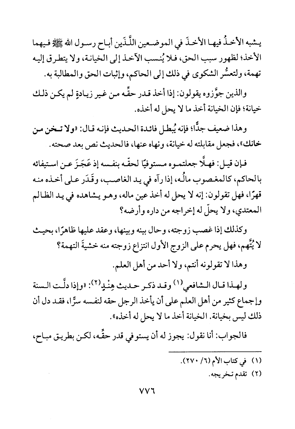 ولهذا قال الشافعي (¬1) وقد ذكر حديث هِنْدٍ (¬2): "وإذا دلَّت السنة وإجماع كثير من أهل العلم على أن يأخذ الرجل حقه لنفسه سرًّا، فقد دل أن ذلك ليس بخيانة. الخيانة أخذ ما لا يحل له أخذه".