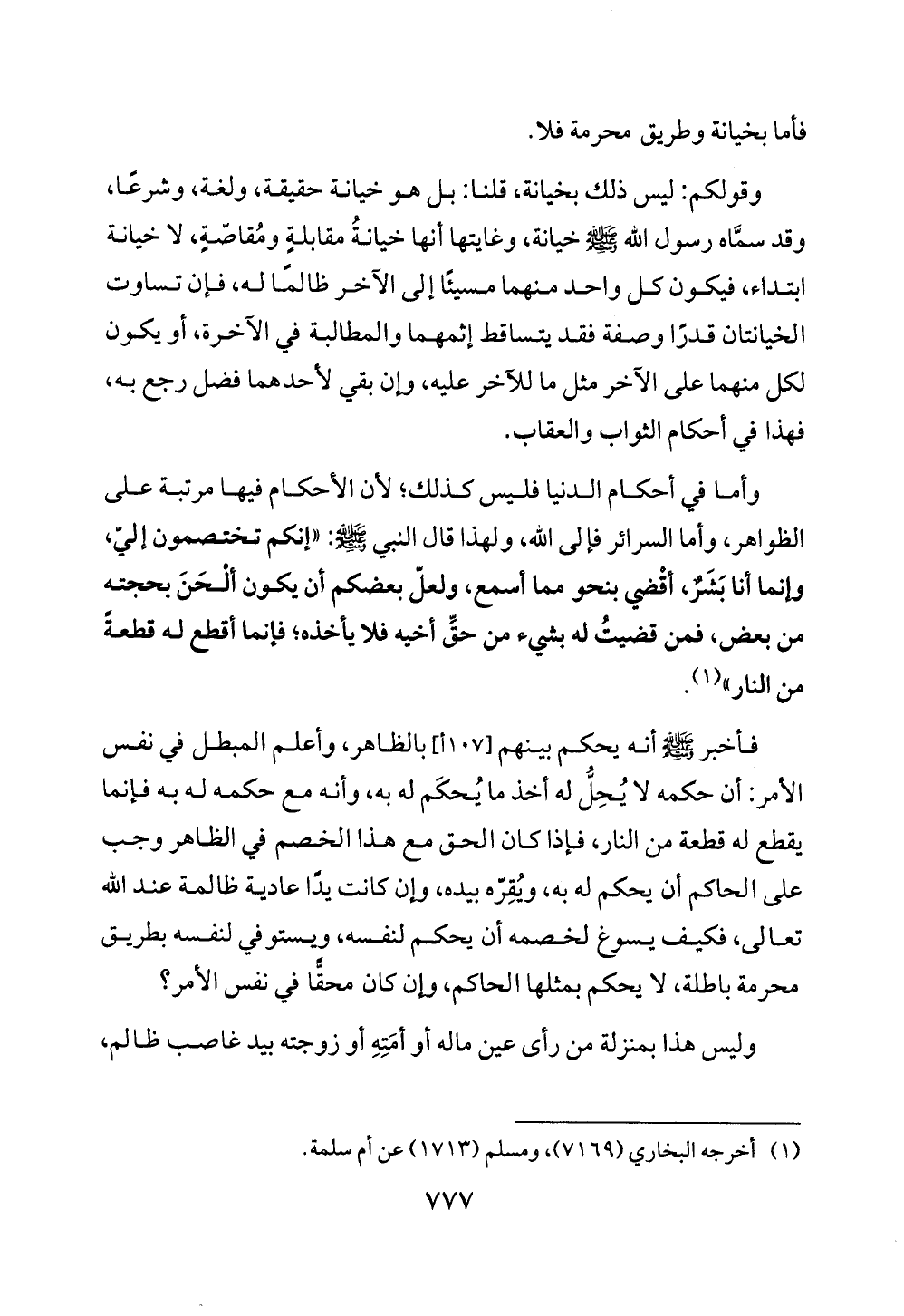 فأخبر- صلى الله عليه وسلم - أنه يحكم بينهم [107 أ] بالظاهر، وأعلم المبطل في نفس الأمر: أن حكمه لا يُحِل له أخذ ما يُحكَم له به، وأنه مع حكمه له به فإنما يقطع له قطعة من النار، فإذا كان الحق مع هذا الخصم في الظاهر وجب على الحاكم أن يحكم له به، ويُقِرّه بيده، وإن كانت يدًا عادية ظالمة عند الله تعالى، فكيف يسوغ لخصمه أن يحكم لنفسه، ويستوفي لنفسه بطريق محرمة باطلة، لا يحكم بمثلها الحاكم، وإن كان محقًّا في نفس الأمر؟