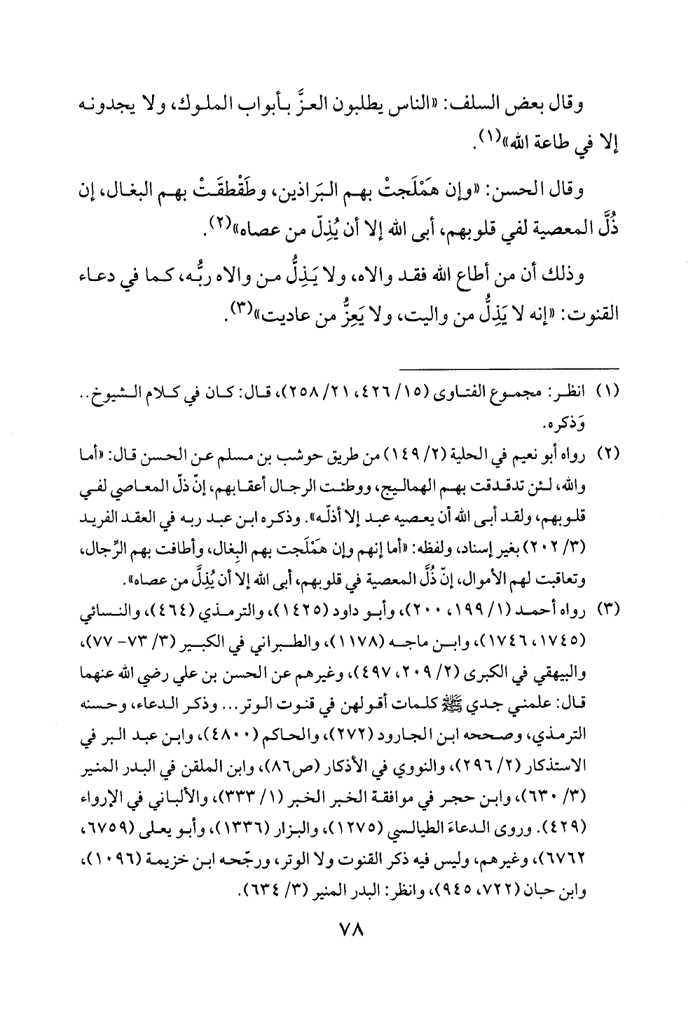 (¬3) رواه أحمد (1/ 199، 200)، وأبو داود (1425)، والترمذي (464)، والنسائي (1745، 1746)، وابن ماجه (1178)، والطبراني في الكبير (3/ 73 - 77)، والبيهقي في الكبرى (2/ 209، 497)، وغيرهم عن الحسن بن علي رضي الله عنهما قال: علمني جدي - صلى الله عليه وسلم - كلمات أقولهن في قنوت الوتر ... وذكر الدعاء، وحسنه الترمذي، وصححه ابن الجارود (272)، والحاكم (4800)، وابن عبد البر في الاستذكار (2/ 296)، والنووي في الأذكار (ص 86)، وابن الملقن في البدر المنير (3/ 630)، وابن حجر في موافقة الخبر الخبر (1/ 333)، والألباني في الإرواء (429). وروى الدعاءَ الطيالسي (1275)، والبزار (1336)، وأبو يعلى (6759، 6762)، وغيرهم، وليس فيه ذكر القنوت ولا الوتر، ورجّحه ابن خزيمة (1096)، وابن حبان (722، 945)، وانظر: البدر المنير (3/ 634).