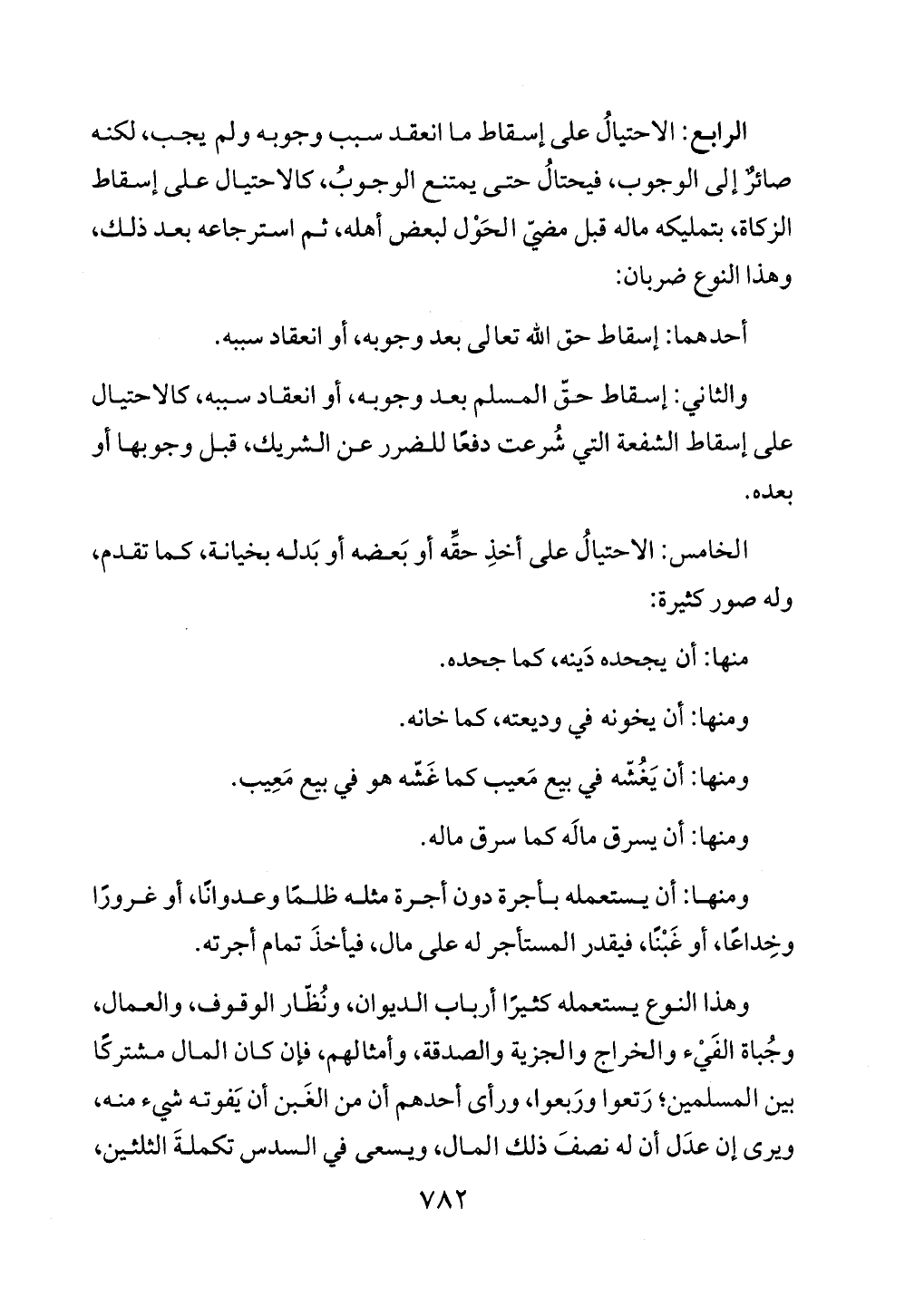 الرابع: الاحتيالُ على إسقاط ما انعقد سبب وجوبه ولم يجب، لكنه صائر إلى الوجوب، فيحتالُ حتى يمتنع الوجوبُ، كالاحتيال على إسقاط الزكاة، بتمليكه ماله قبل مضيّ الحَوْل لبعض أهله، ثم استرجاعه بعد ذلك، وهذا النوع ضربان: