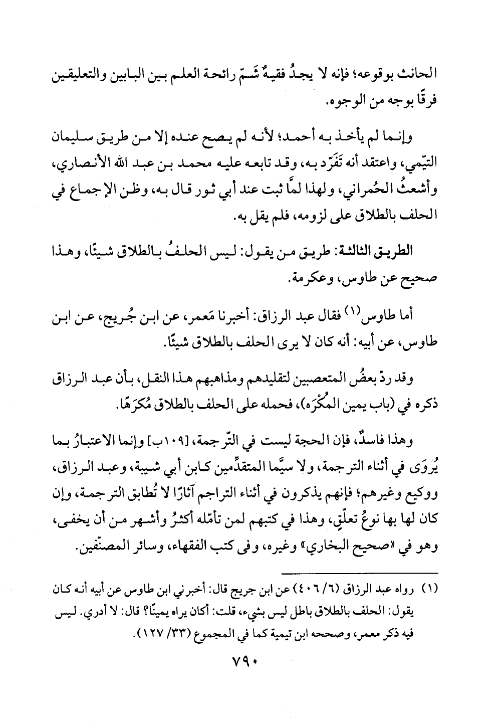 (¬1) رواه عبد الرزاق (6/ 406) عن ابن جريج قال: أخبرني ابن طاوس عن أبيه أنه كان يقول: الحلف بالطلاق باطل ليس بشيء، قلت: أكان يراه يمينًا؟ قال: لا أدري. ليس فيه ذكر معمر، وصححه ابن تيمية كما في المجموع (33/ 127).