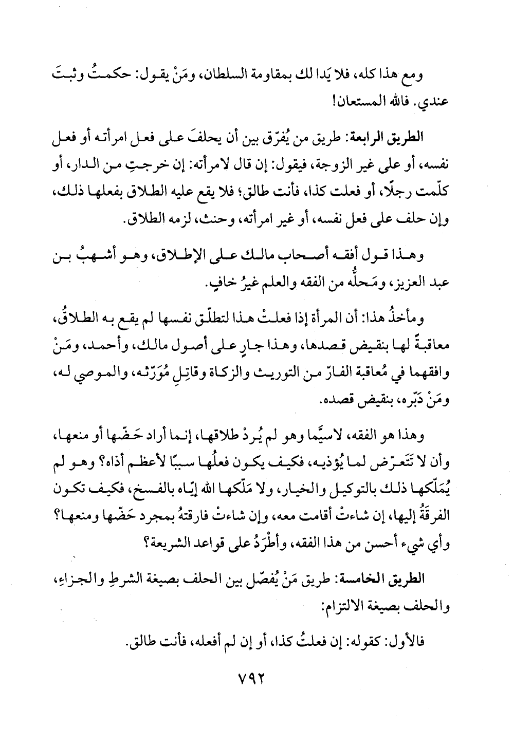 الطريق الرابعة: طريق من يُفرّق بين أن يحلفَ على فعل امرأته أو فعل نفسه، أو على غير الزوجة، فيقول: إن قال لامرأته: إن خرجتِ من الدار، أو كلّمت رجلًا، أو فعلت كذا، فأنت طالق؛ فلا يقع عليه الطلاق بفعلها ذلك، وإن حلف على فعل نفسه، أو غير امرأته، وحنث، لزمه الطلاق.