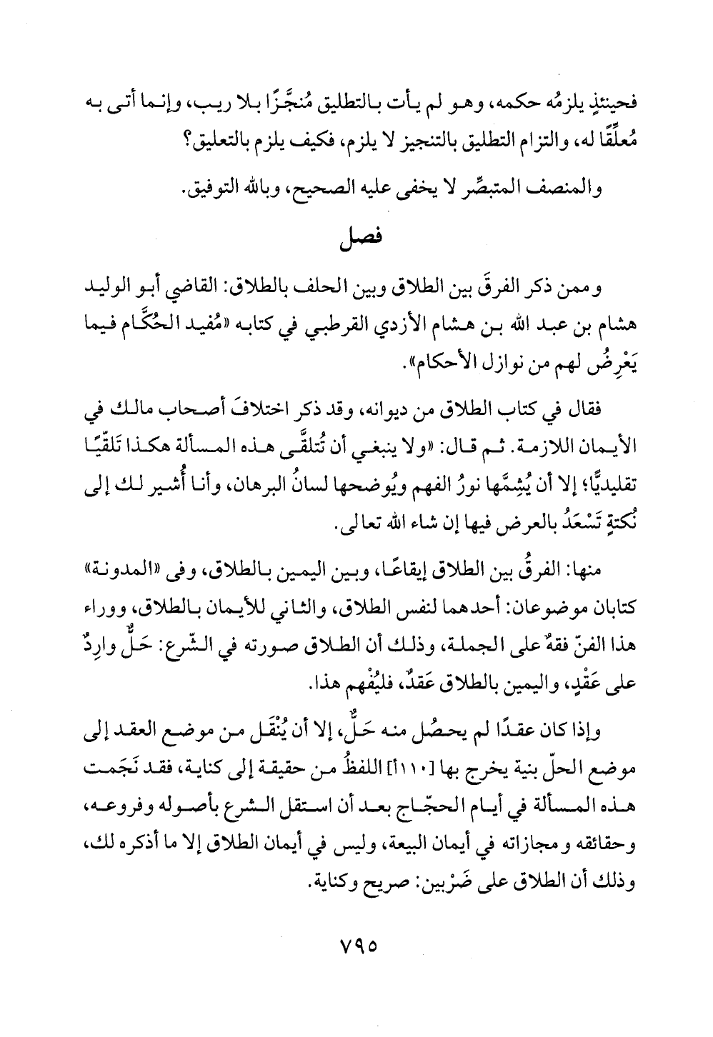 منها: الفرقُ بين الطلاق إيقاعًا، وبين اليمين بالطلاق، وفى "المدونة" كتابان موضوعان: أحدهما لنفس الطلاق، والثاني للأيمان بالطلاق، ووراء هذا الفنّ فقهٌ على الجملة، وذلك أن الطلاق صورته في الشّرع: حَلٌّ وارِدٌ على عَقْدٍ، واليمين بالطلاق عَقدٌ، فليُفْهم هذا.
