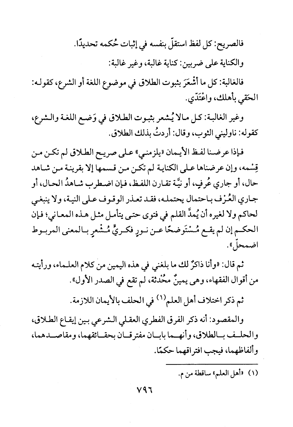 فإذا عرضنا لفظ الأيمان "يلزمني" على صريح الطلاق لم تكن من قِسْمه، وإن عرضناها على الكناية لم تكن من قسمها إلا بقرينة من شاهد حال، أو جاري عُرفٍ، أو نيَّة تقارن اللفظ، فإن اضطرب شاهدُ الحال، أو جاري العُرْف باحتمال يحتمله، فقد تعذر الوقوف على النية، ولا ينبغي لحاكم ولا لغيره أن يُمدَّ القلم في فتوى حتى يتأمل مثل هذه المعاني؛ فإن الحكم إن لم يقع مُسْتَوضحًا عن نورٍ فكريٍّ مُشْعرٍ بالمعنى المربوط اضمحلّ".