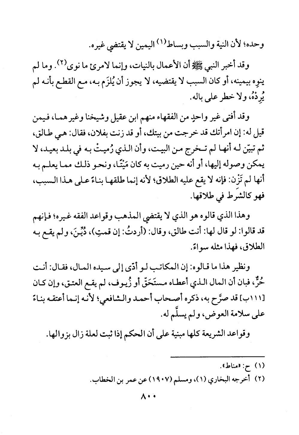 وقد أخبر النبي - صلى الله عليه وسلم - أن الأعمال بالنيات، وإنما لامرئ ما نوى (¬2). وما لم ينوِه بيمينه، أو كان السبب لا يقتضيه، لا يجوز أن يُلزَم به، مع القطع بأنه لم يُرِدْهُ، ولا خطر على باله.