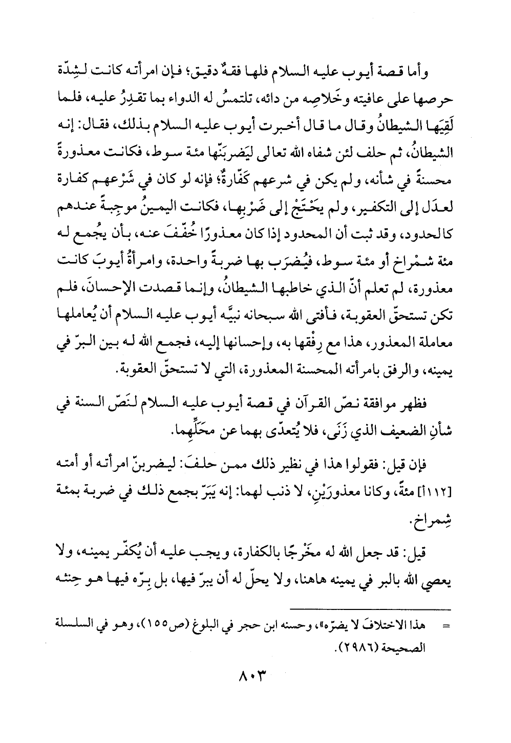 وأما قصة أيوب عليه السلام فلها فقهٌ دقيق؛ فإن امرأته كانت لشِدّة حرصها على عافيته وخَلاصِه من دائه، تلتمسُ له الدواء بما تقدِرُ عليه، فلما لَقِيَها الشيطانُ وقال ما قال أخبرت أيوب عليه السلام بذلك، فقال: إنه الشيطانُ، ثم حلف لئن شفاه الله تعالى ليَضربَنّها مئة سوط، فكانت معذورةً محسنةً في شأنه، ولم يكن في شرعهم كَفّارةٌ؛ فإنه لو كان في شَرْعهم كفارة لعدَل إلى التكفير، ولم يحتَجْ إلى ضَرْبهِا، فكانت اليمينُ موجِبةً عندهم كالحدود، وقد ثبت أن المحدود إذا كان معذورًا خُفّفَ عنه، بأن يجُمع له مئة شمْراخ أو مئة سوط، فيُضرَب بها ضربةً واحدة، وامرأةُ أيوبَ كانت معذورة، لم تعلم أنّ الذي خاطبها الشيطانُ، وإنما قصدت الإحسانَ، فلم تكن تستحقّ العقوبة، فأفتى الله سبحانه نبيَّه أيوب عليه السلام أن يُعاملها معاملة المعذور، هذا مع رِفْقها به، وإحسانها إليه، فجمع الله له بين البرّ في يمينه، والرفق بامرأته المحسنة المعذورة، التي لا تستحقّ العقوبة.