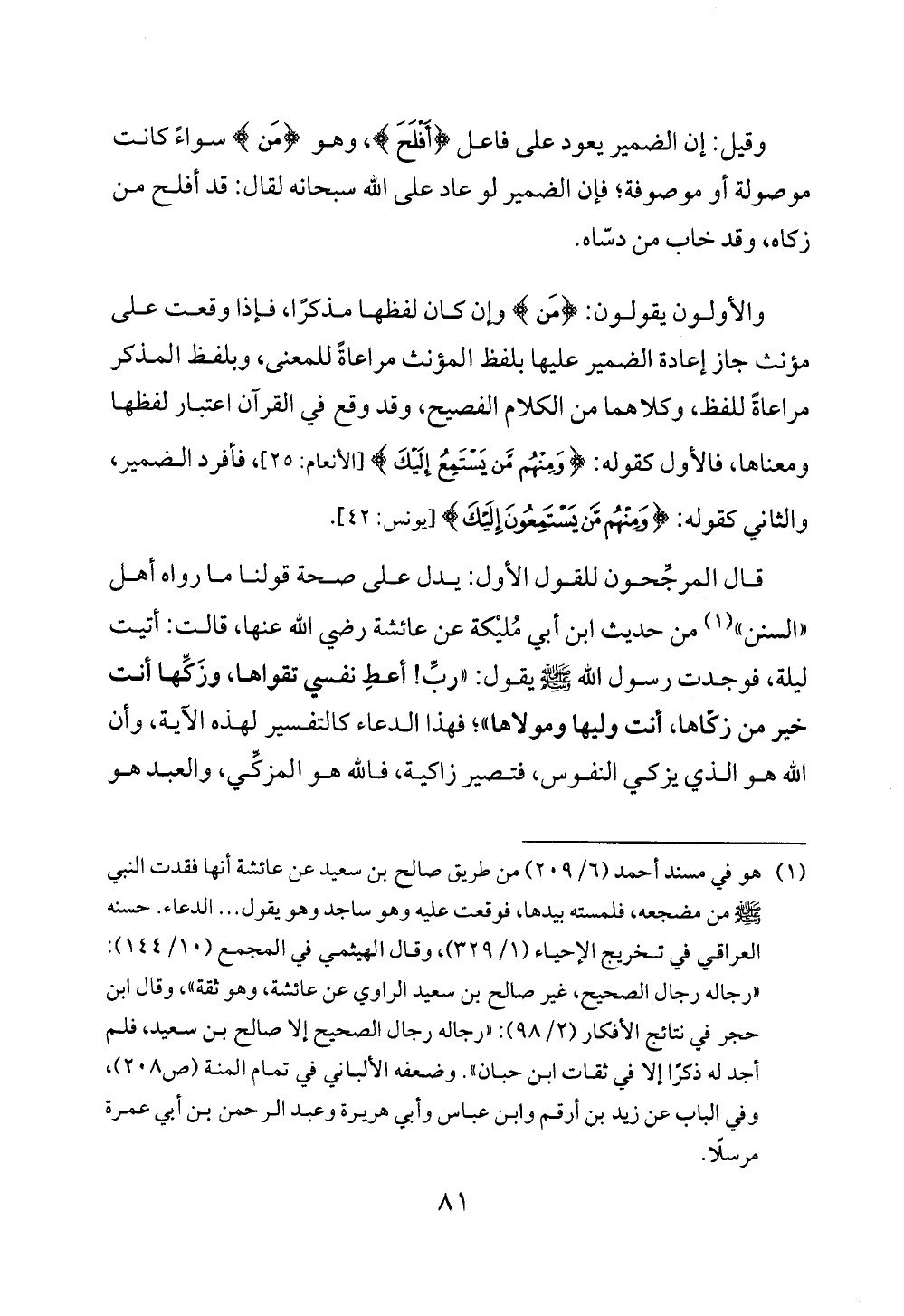 قال المرجِّحون للقول الأول: يدل على صحة قولنا ما رواه أهل "السنن" (¬1) من حديث ابن أبي مُليْكة عن عائشة رضي الله عنها، قالت: أتيت ليلة، فوجدت رسول الله - صلى الله عليه وسلم - يقول: "ربِّ! أعطِ نفسي تقواها، وزَكِّها أنت خير من زكّاها، أنت وليها ومولاها"؛ فهذا الدعاء كالتفسير لهذه الآية، وأن الله هو الذي يزكي النفوس، فتصير زاكية، فالله هو المزكّي، والعبد هو