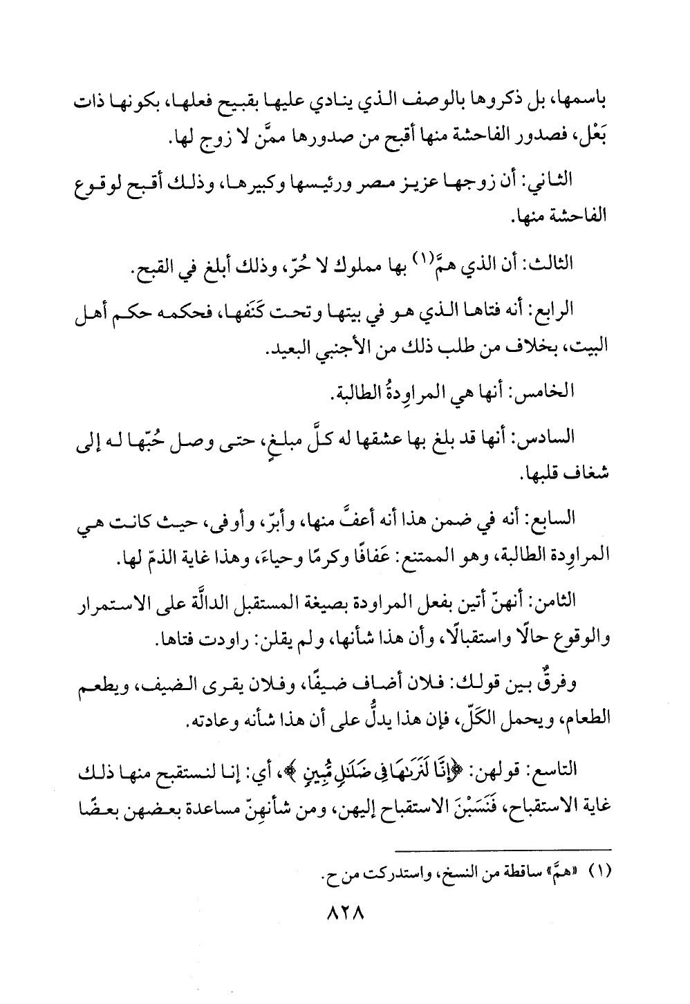 التاسع: قو لهن: {إِنَّا لَنَرَاهَا فِي ضَلَالٍ مُبِينٍ}، أي: إنا لنستقبح منها ذلك غاية الاستقباح، فَنَسَبْنَ الاستقباح إليهن، ومن شأنهِنّ مساعدة بعضهن بعضًا
