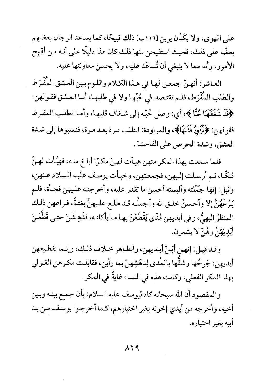 العاشر: أنهنّ جمعن لها في هذا الكلام واللوم بين العشق المُفْرَط والطلب المُفْرَط، فلم تقتصد في حُبِّها ولا في طلبها، أما العشق فقولهن: {قَدْ شَغَفَهَا حُبًّا}، أي: وصل حُبّه إلى شغاف قلبها، وأما الطلب المفرط فقو لهن: {تُرَاوِدُ فَتَاهَا}، والمراودة: الطلب مرة بعد مرة، فنسبوها إلى شدة العشق، وشدة الحرص على الفاحشة.