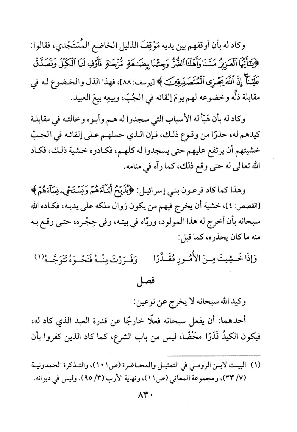أحدهما: أن يفعل سبحانه فعلًا خارجًا عن قدرة العبد الذي كاد له، فيكون الكيدُ قَدَرًا مَحْضًا، ليس من باب الشرع، كما كاد الذين كفروا بأن