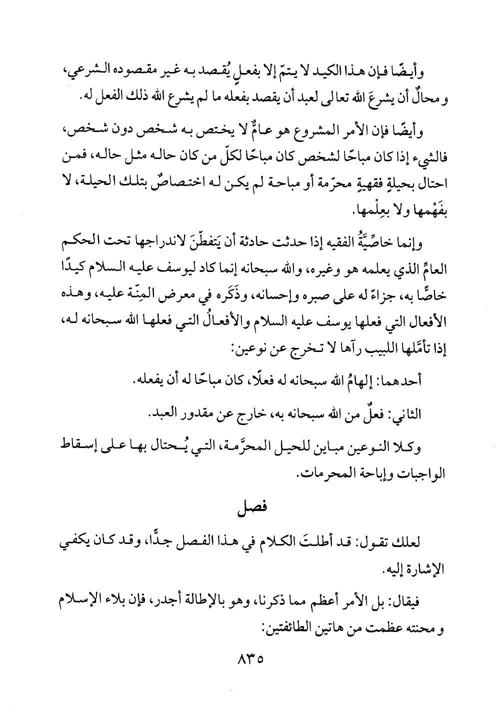 وإنما خاصِّيَّةُ الفقيه إذا حدثت حادثة أن يَتفطّنَ لاندراجها تحت الحكم العامِّ الذي يعلمه هو وغيره، والله سبحانه إنما كاد ليوسف عليه السلام كيدًا خاصًّا به، جزاءً له على صبره وإحسانه، وذَكَره في معرض المِنّة عليه، وهذه الأفعال التي فعلها يوسف عليه السلام والأفعالُ التي فعلها الله سبحانه له، إذا تأمَّلها اللبيب رآها لا تخرج عن نوعين: