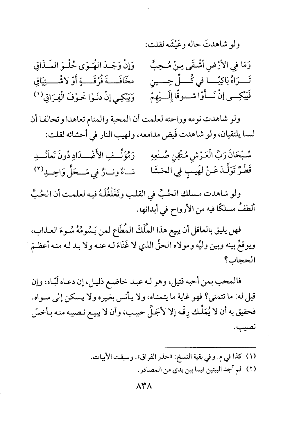 ولو شاهدت نومه وراحته لعلمت أن المحبة والمنام تعاهدا وتحالفا أن ليسا يلتقيان، ولو شاهدت فَيض مدامعه، ولهيب النار في أحشائه لقلت:
