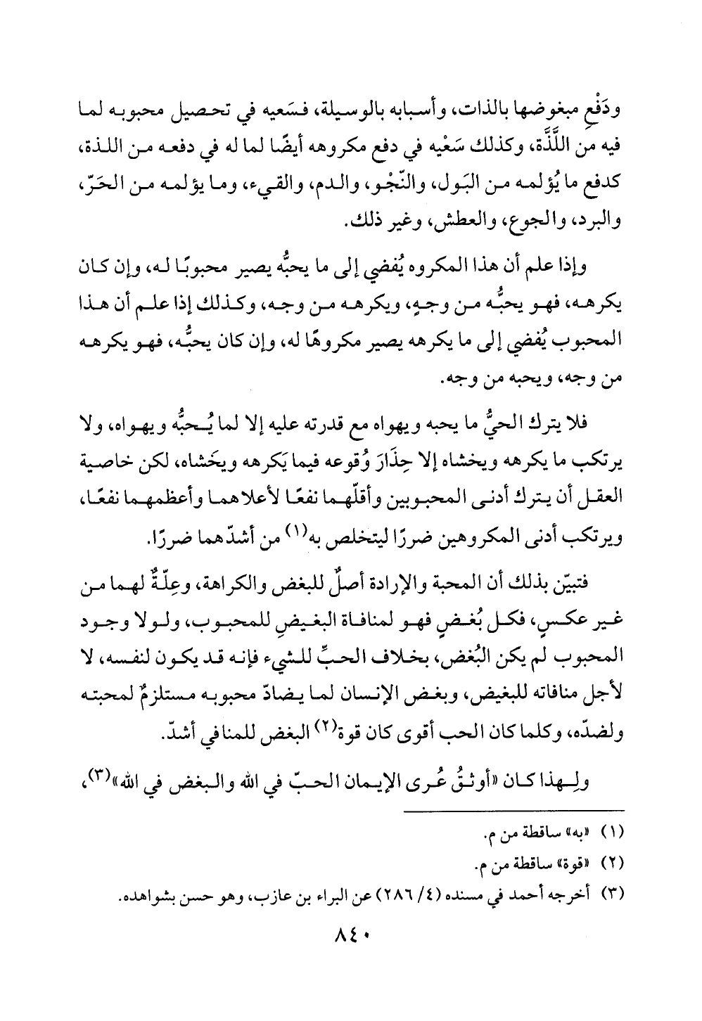 ودَفْعِ مبغوضها بالذات، وأسبابه بالوسيلة، فسَعيه في تحصيل محبوبه لما فيه من اللَّذَّة، وكذلك سَعْيه في دفع مكروهه أيضًا لما له في دفعه من اللذة، كدفع ما يُؤلمه من البَول، والنّجْو، والدم، والقيء، وما يؤلمه من الحَرّ، والبرد، والجوع، والعطش، وغير ذلك.