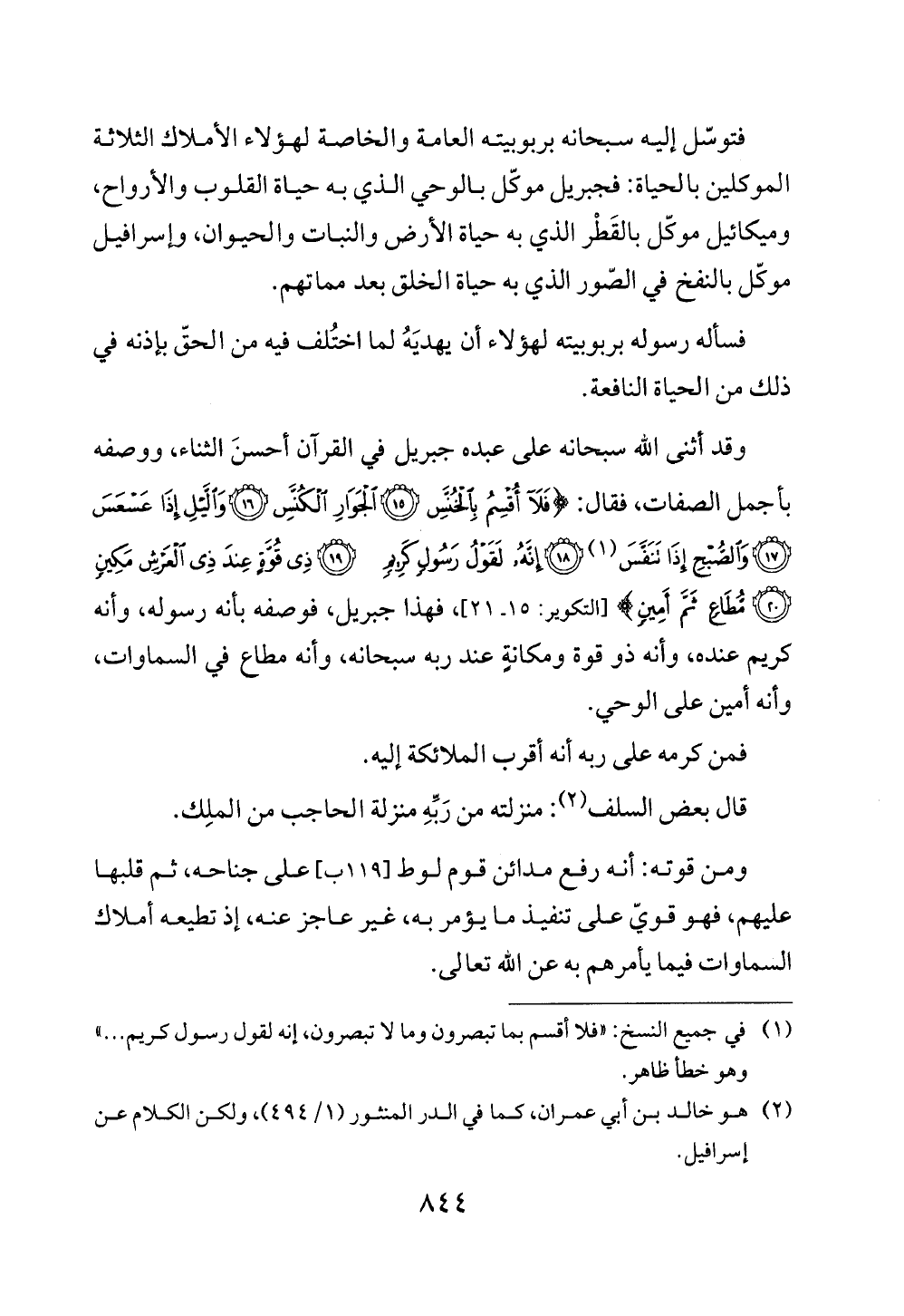 وقد أثنى الله سبحانه على عبده جبريل في القرآن أحسنَ الثناء، ووصفه بأجمل الصفات، فقال: {فَلَا أُقْسِمُ بِالْخُنَّسِ (15) الْجَوَارِ الْكُنَّسِ (16) وَاللَّيْلِ إِذَا عَسْعَسَ (17) وَالصُّبْحِ إِذَا تَنَفَّسَ (¬1) (18) إِنَّهُ لَقَوْلُ رَسُولٍ كَرِيمٍ (19) ذِي قُوَّةٍ عِنْدَ ذِي الْعَرْشِ مَكِينٍ (20) مُطَاعٍ ثَمَّ أَمِينٍ} [التكوير: 15 - 21]، فهذا جبريل، فوصفه بأنه رسوله، وأنه كريم عنده، وأنه ذو قوة ومكانةٍ عند ربه سبحانه، وأنه مطاع في السماوات، وأنه أمين على الوحي.