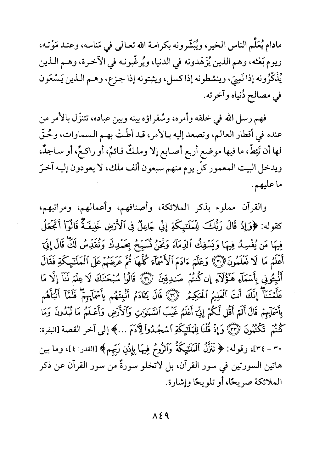 والقرآن مملوء بذكر الملائكة، وأصنافهم، وأعمالهم، ومراتبهم، كقوله: {وَإِذْ قَالَ رَبُّكَ لِلْمَلَائِكَةِ إِنِّي جَاعِلٌ فِي الْأَرْضِ خَلِيفَةً قَالُوا أَتَجْعَلُ فِيهَا مَنْ يُفْسِدُ فِيهَا وَيَسْفِكُ الدِّمَاءَ وَنَحْنُ نُسَبِّحُ بِحَمْدِكَ وَنُقَدِّسُ لَكَ قَالَ إِنِّي أَعْلَمُ مَا لَا تَعْلَمُونَ (30) وَعَلَّمَ آدَمَ الْأَسْمَاءَ كُلَّهَا ثُمَّ عَرَضَهُمْ عَلَى الْمَلَائِكَةِ فَقَالَ أَنْبِئُونِي بِأَسْمَاءِ هَؤُلَاءِ إِنْ كُنْتُمْ صَادِقِينَ (31) قَالُوا سُبْحَانَكَ لَا عِلْمَ لَنَا إِلَّا مَا عَلَّمْتَنَا إِنَّكَ أَنْتَ الْعَلِيمُ الْحَكِيمُ (32) قَالَ يَاآدَمُ أَنْبِئْهُمْ بِأَسْمَائِهِمْ فَلَمَّا أَنْبَأَهُمْ بِأَسْمَائِهِمْ قَالَ أَلَمْ أَقُلْ لَكُمْ إِنِّي أَعْلَمُ غَيْبَ السَّمَاوَاتِ وَالْأَرْضِ وَأَعْلَمُ مَا تُبْدُونَ وَمَا كُنْتُمْ تَكْتُمُونَ (33) وَإِذْ قُلْنَا لِلْمَلَائِكَةِ اسْجُدُوا لِآدَمَ ...} إلى آخر القصة [البقرة: 30 - 34]، وقوله: {تَنَزَّلُ الْمَلَائِكَةُ وَالرُّوحُ فِيهَا بِإِذْنِ رَبِّهِمْ} [القدر: 4]، وما بين هاتين السورتين في سور القرآن، بل لا تخلو سورةٌ من سور القرآن عن ذكر الملائكة صريحًا، أو تلويحًا وإشارة.