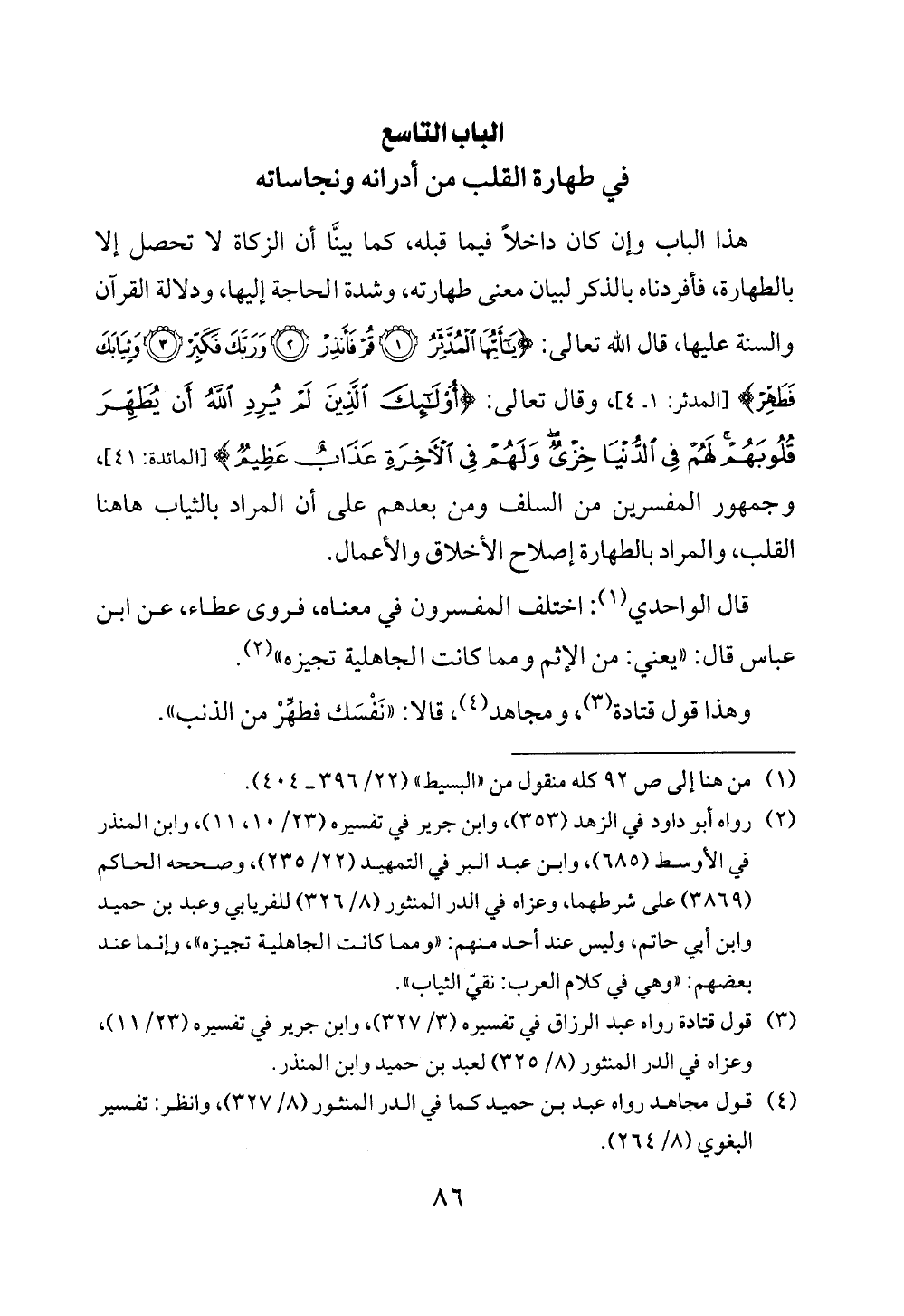 هذا الباب وإن كان داخلاً فيما قبله، كما بينَّا أن الزكاة لا تحصل إلا بالطهارة، فأفردناه بالذكر لبيان معنى طهارته، وشدة الحاجة إليها، ودلالة القرآن والسنة عليها، قال الله تعالى: {يَاأَيُّهَا الْمُدَّثِّرُ (1) قُمْ فَأَنْذِرْ (2) وَرَبَّكَ فَكَبِّرْ (3) وَثِيَابَكَ فَطَهِّرْ} [المدثر: 1 - 4]، وقال تعالى: {أُولَئِكَ الَّذِينَ لَمْ يُرِدِ اللَّهُ أَنْ يُطَهِّرَ قُلُوبَهُمْ لَهُمْ فِي الدُّنْيَا خِزْيٌ وَلَهُمْ فِي الْآخِرَةِ عَذَابٌ عَظِيمٌ} [المائدة: 41]، وجمهور المفسرين من السلف ومن بعدهم على أن المراد بالثياب هاهنا القلب، والمراد بالطهارة إصلاح الأخلاق والأعمال.