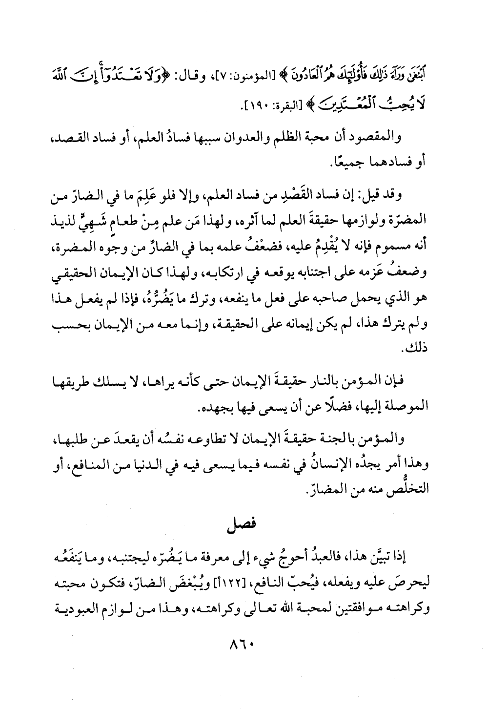 إذا تبيَّن هذا، فالعبدُ أحوجُ شيء إلى معرفة ما يَضُرّه ليجتنبه، وما يَنفَعُه ليحرصَ عليه ويفعله، فيُحبّ النافع، [122 أ]، ويُبْغضَ الضارّ، فتكون محبته وكراهته موافقتين لمحبة الله تعالى وكراهته، وهذا من لوازم العبودية