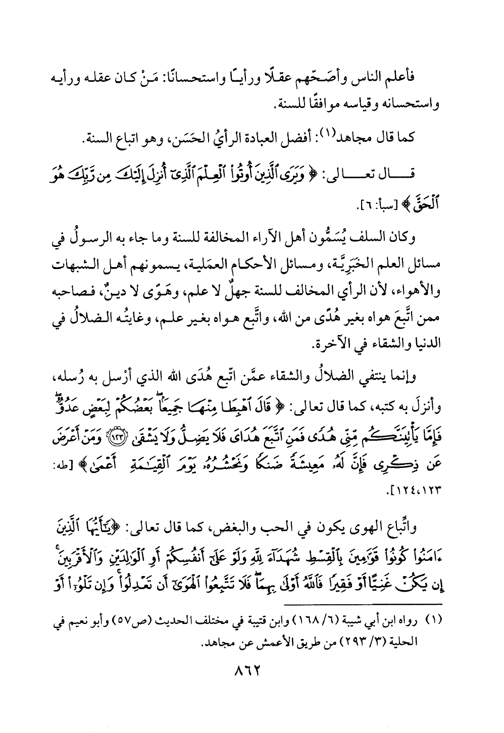 وكان السلف يُسَمُّون أهل الآراء المخالفة للسنة وما جاء به الرسولُ في مسائل العلم الخَبَرِيَّة، ومسائل الأحكام العمَلية، يسمونهم أهل الشبهات والأهواء، لأن الرأي المخالف للسنة جهلٌ لا علم، وهَوًى لا دينٌ، فصاحبه ممن اتَّبعَ هواه بغير هُدًى من الله، واتَّبع هواه بغير علم، وغايتُه الضلالُ في الدنيا والشقاء في الآخرة.