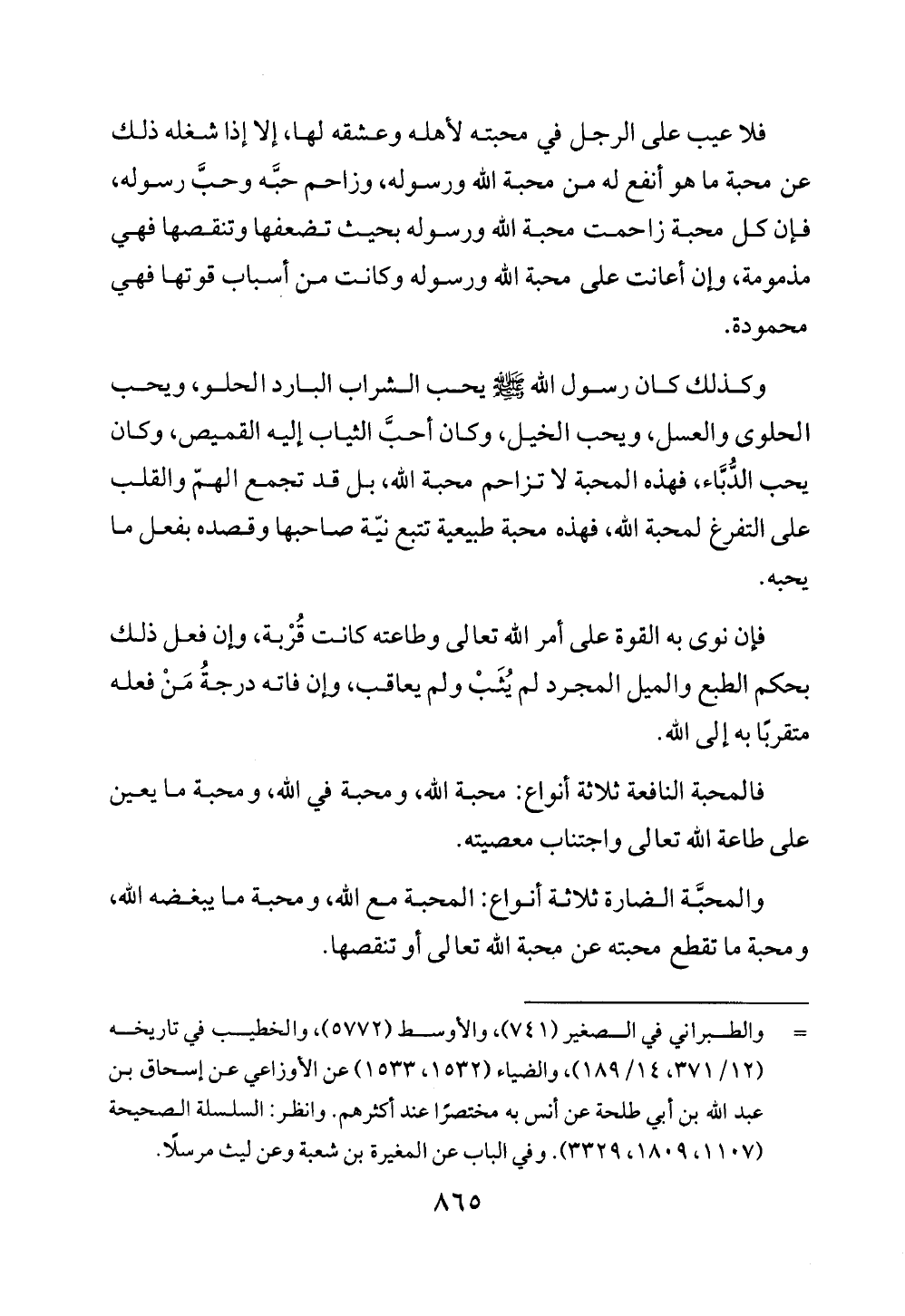 وكذلك كان رسول الله - صلى الله عليه وسلم - يحب الشراب البارد الحلو، ويحب الحلوى والعسل، ويحب الخيل، وكان أحبَّ الثياب إليه القميص، وكان يحب الدُّبَّاء، فهذه المحبة لا تزاحم محبة الله، بل قد تجمع الهمّ والقلب على التفرغ لمحبة الله، فهذه محبة طبيعية تتبع نيّة صاحبها وقصده بفعل ما يحبه.