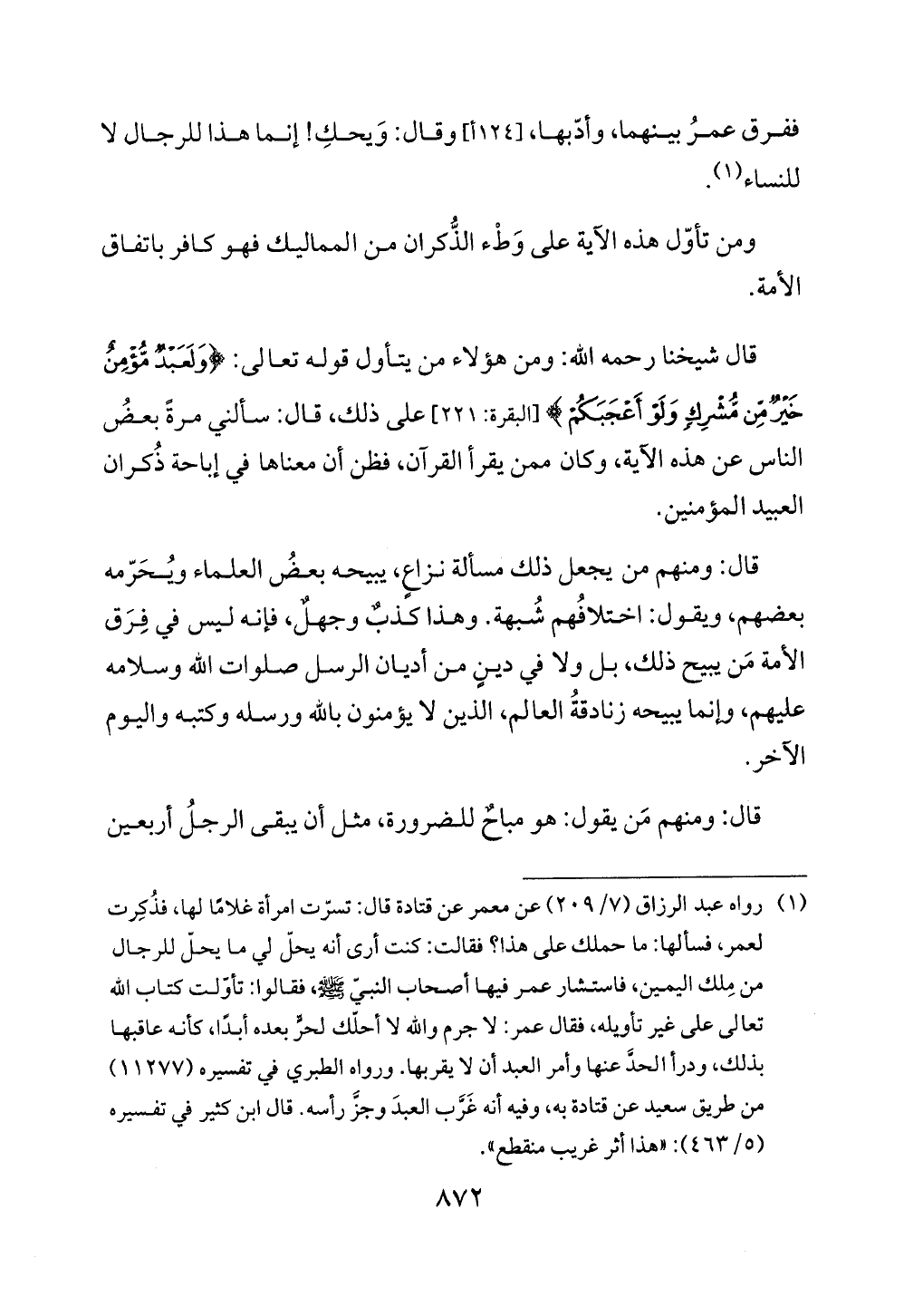 قال شيخنا رحمه الله: ومن هؤلاء من يتأول قوله تعالى: {وَلَعَبْدٌ مُؤْمِنٌ خَيْرٌ مِنْ مُشْرِكٍ وَلَوْ أَعْجَبَكُمْ} [البقرة: 221] على ذلك، قال: سألني مرةً بعضُ الناس عن هذه الآية، وكان ممن يقرأ القرآن، فظن أن معناها في إباحة ذُكران العبيد المؤمنين.