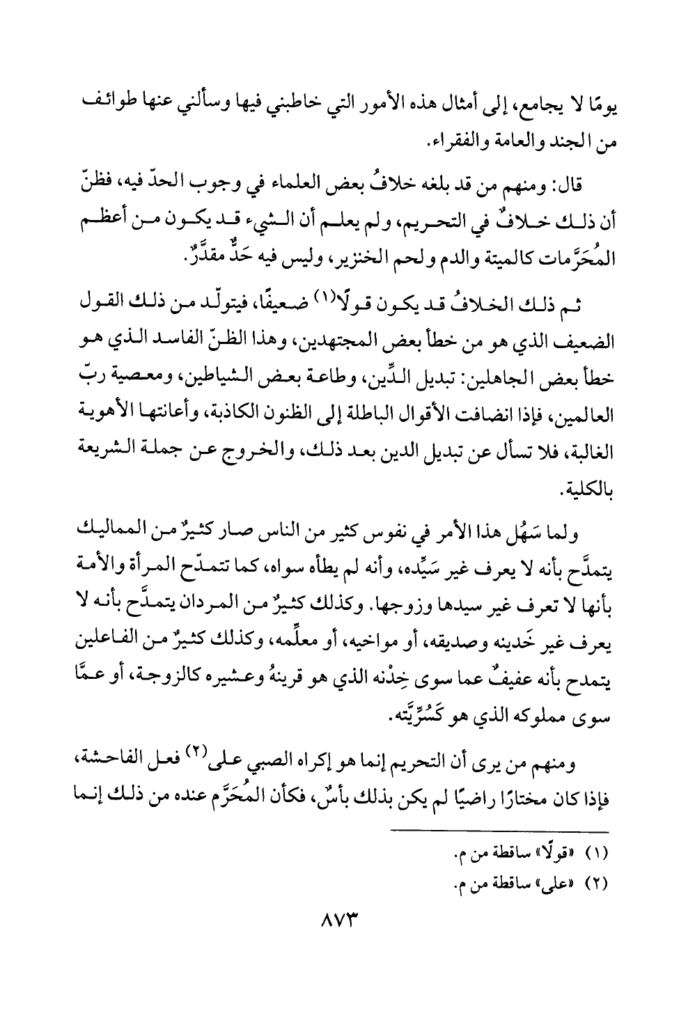 يومًا لا يجامع، إلى أمثال هذه الأمور التي خاطبني فيها وسألني عنها طوائف من الجند والعامة والفقراء.