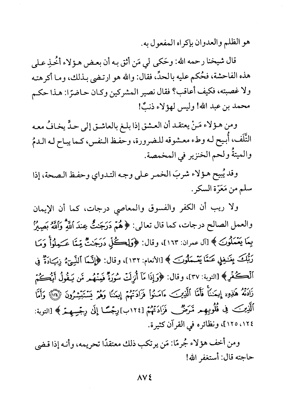 ولا ريب أن الكفر والفسوق والمعاصي درجات، كما أن الإيمان والعمل الصالح درجات، كما قال تعالى: {هُمْ دَرَجَاتٌ عِنْدَ اللَّهِ وَاللَّهُ بَصِيرٌ بِمَا يَعْمَلُونَ} [آل عمران: 163]، وقال: {وَلِكُلٍّ دَرَجَاتٌ مِمَّا عَمِلُوا وَمَا رَبُّكَ بِغَافِلٍ عَمَّا يَعْمَلُونَ} [الأنعام: 132]، وقال: {إِنَّمَا النَّسِيءُ زِيَادَةٌ فِي الْكُفْرِ} [التوبة: 37]، وقال: {وَإِذَا مَا أُنْزِلَتْ سُورَةٌ فَمِنْهُمْ مَنْ يَقُولُ أَيُّكُمْ زَادَتْهُ هَذِهِ إِيمَانًا فَأَمَّا الَّذِينَ آمَنُوا فَزَادَتْهُمْ إِيمَانًا وَهُمْ يَسْتَبْشِرُونَ (124) وَأَمَّا الَّذِينَ فِي قُلُوبِهِمْ مَرَضٌ فَزَادَتْهُمْ رِجْسًا إِلَى رِجْسِهِمْ} [التوبة: 124, 125]، ونظائره في القرآن كثيرة.