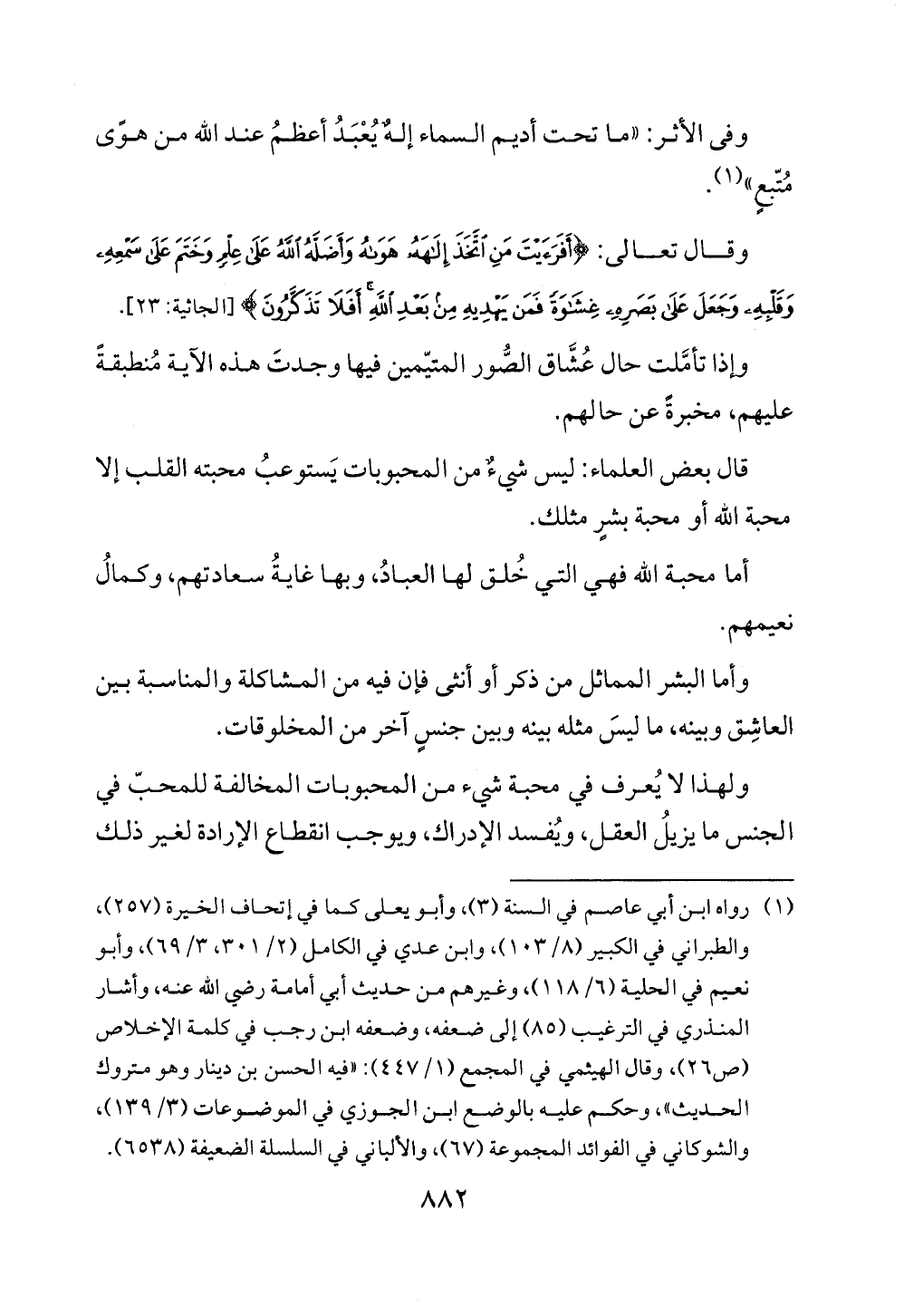 ولهذا لا يُعرف في محبة شيء من المحبوبات المخالفة للمحبّ في الجنس ما يزيلُ العقل، ويُفسد الإدراك، ويوجب انقطاع الإرادة لغير ذلك
