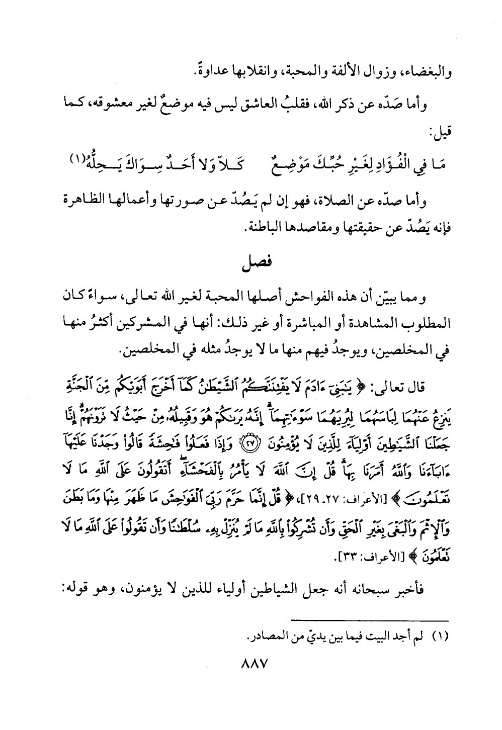 قال تعالى: {يَابَنِي آدَمَ لَا يَفْتِنَنَّكُمُ الشَّيْطَانُ كَمَا أَخْرَجَ أَبَوَيْكُمْ مِنَ الْجَنَّةِ يَنْزِعُ عَنْهُمَا لِبَاسَهُمَا لِيُرِيَهُمَا سَوْآتِهِمَا إِنَّهُ يَرَاكُمْ هُوَ وَقَبِيلُهُ مِنْ حَيْثُ لَا تَرَوْنَهُمْ إِنَّا جَعَلْنَا الشَّيَاطِينَ أَوْلِيَاءَ لِلَّذِينَ لَا يُؤْمِنُونَ (27) وَإِذَا فَعَلُوا فَاحِشَةً قَالُوا وَجَدْنَا عَلَيْهَا آبَاءَنَا وَاللَّهُ أَمَرَنَا بِهَا قُلْ إِنَّ اللَّهَ لَا يَأْمُرُ بِالْفَحْشَاءِ أَتَقُولُونَ عَلَى اللَّهِ مَا لَا تَعْلَمُونَ} [الأعراف: 27 - 29]، {قُلْ إِنَّمَا حَرَّمَ رَبِّيَ الْفَوَاحِشَ مَا ظَهَرَ مِنْهَا وَمَا بَطَنَ وَالْإِثْمَ وَالْبَغْيَ بِغَيْرِ الْحَقِّ وَأَنْ تُشْرِكُوا بِاللَّهِ مَا لَمْ يُنَزِّلْ بِهِ سُلْطَانًا وَأَنْ تَقُولُوا عَلَى اللَّهِ مَا لَا تَعْلَمُونَ} [الأعراف: 33].