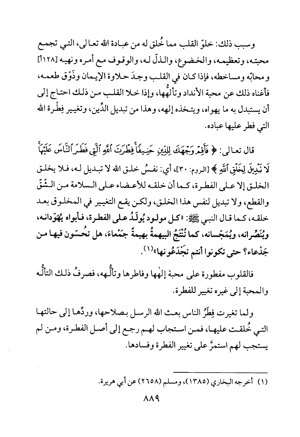 فالقلوب مفطورة على محبة إلهها وفاطرها وتألُّهه، فصرفُ ذلك التألُّه والمحبة إلى غيره تغيير للفطرة.