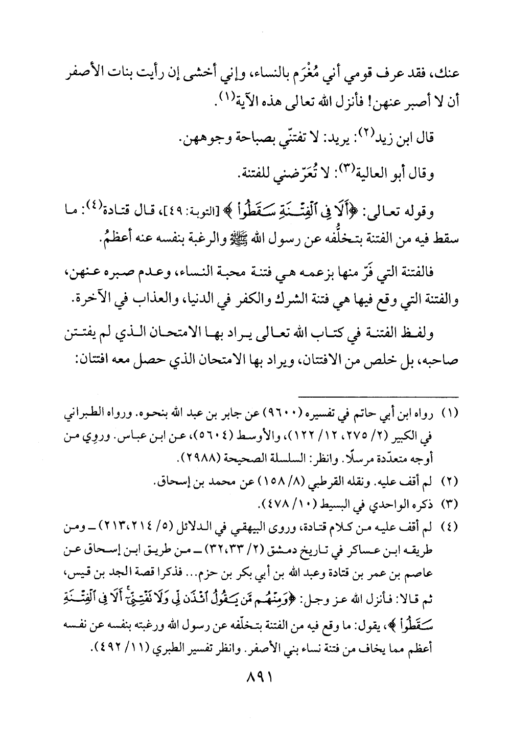 عنك، فقد عرف قومي أني مُغْرَم بالنساء، وإني أخشى إن رأيت بنات الأصفر أن لا أصبر عنهن! فأنزل الله تعالى هذه الآية (¬1).