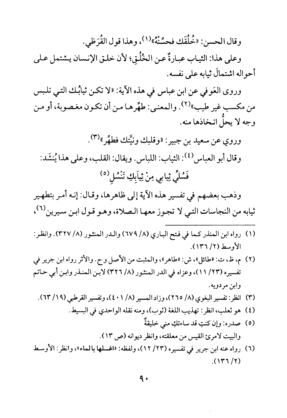 وروى العَوفي عن ابن عباس في هذه الآية: "لا تكن ثيابُك التي تلبس من مكسب غير طيب" (¬2). والمعنى: طهِّرها من أن تكون مغصوبة، أو من وجه لا يحلُّ اتخاذها منه.