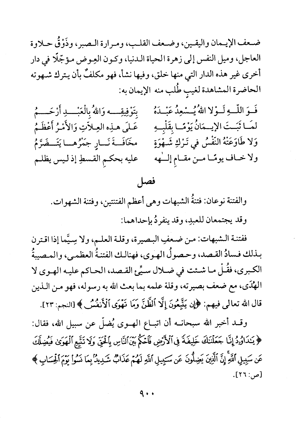 ففتنة الشبهات: من ضعفِ البصيرة، وقلة العلم، ولا سيَّما إذا اقترن بذلك فسادُ القصد، وحصولُ الهوى، فهنالك الفتنةُ العظمى، والمصيبةُ الكبرى، فقُلْ ما شئت في ضلال سيِّئ القصد، الحاكم عليه الهوى لا الهُدَى، مع ضعف بصيرته، وقلة علمه بما بعث الله به رسوله، فهو من الذين قال الله تعالى فيهم: {إِنْ يَتَّبِعُونَ إِلَّا الظَّنَّ وَمَا تَهْوَى الْأَنْفُسُ} [النجم: 23].