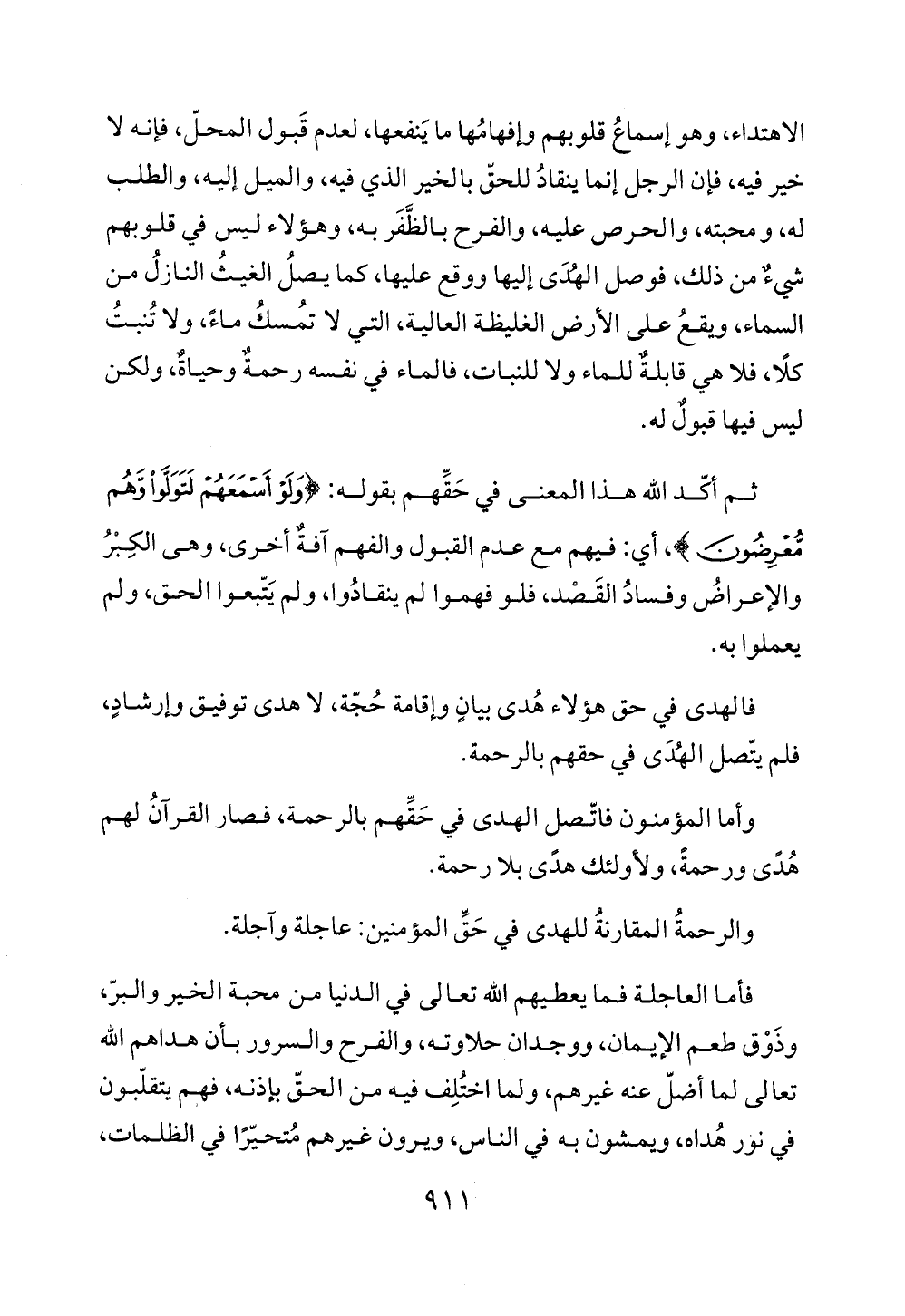 الاهتداء، وهو إسماعُ قلوبهم وإفهامُها ما يَنفعها، لعدم قَبول المحلّ، فإنه لا خير فيه، فإن الرجل إنما ينقادُ للحقّ بالخير الذي فيه، والميل إليه، والطلب له، ومحبته، والحرص عليه، والفرح بالظَّفَر به، وهؤلاء ليس في قلوبهم شيءٌ من ذلك، فوصل الهُدَى إليها ووقع عليها، كما يصلُ الغيثُ النازلُ من السماء، ويقعُ على الأرض الغليظة العالية، التي لا تمُسكُ ماءً، ولا تُنبتُ كلاً، فلا هي قابلةٌ للماء ولا للنبات، فالماء في نفسه رحمةٌ وحياةٌ، ولكن ليس فيها قبولٌ له.