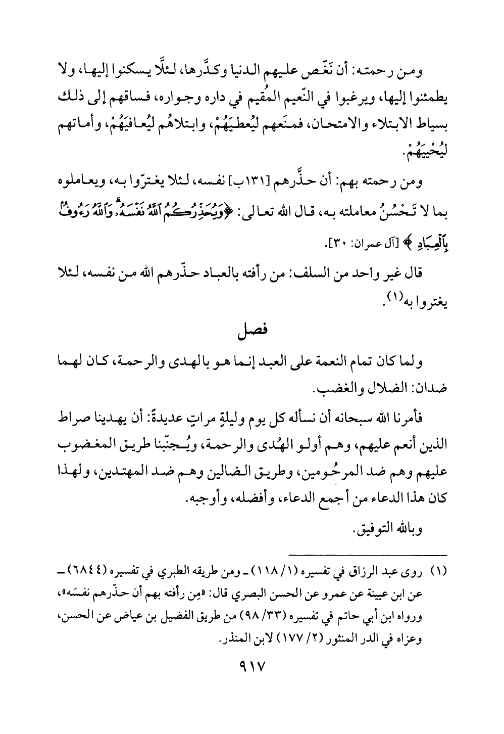 (¬1) روى عبد الرزاق في تفسيره (1/ 118) - ومن طريقه الطبري في تفسيره (6844) - عن ابن عيينة عن عمرو عن الحسن البصري قال: "مِن رأفته بهم أن حذّرهم نفسَه"، ورواه ابن أبي حاتم في تفسيره (33/ 98) من طريق الفضيل بن عياض عن الحسن، وعزاه في الدر المنثور (2/ 177) لابن المنذر.