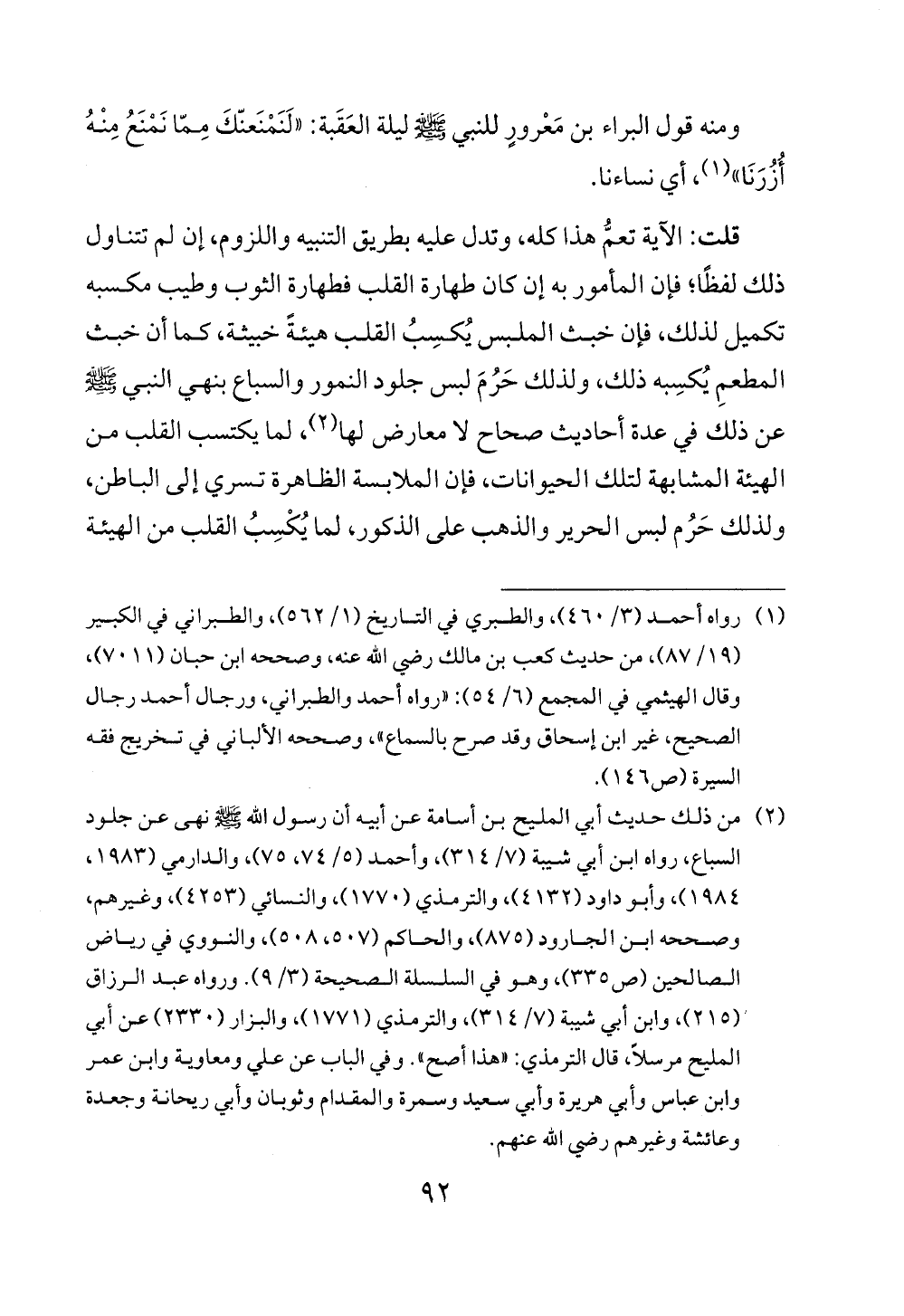 قلت: الآية تعمُّ هذا كله، وتدل عليه بطريق التنبيه واللزوم، إن لم تتناول ذلك لفظًا؛ فإن المأمور به إن كان طهارة القلب فطهارة الثوب وطيب مكسبه تكميل لذلك، فإن خبث الملبس يُكسِبُ القلب هيئةً خبيثة، كما أن خبث المطعمِ يُكسِبه ذلك، ولذلك حَرُمَ لبس جلود النمور والسباع بنهي النبي - صلى الله عليه وسلم - عن ذلك في عدة أحاديث صحاح لا معارض لها (¬2)، لما يكتسب القلب من الهيئة المشابهة لتلك الحيوانات، فإن الملابسة الظاهرة تسري إلى الباطن، ولذلك حَرُم لبس الحرير والذهب على الذكور، لما يُكْسِبُ القلب من الهيئة