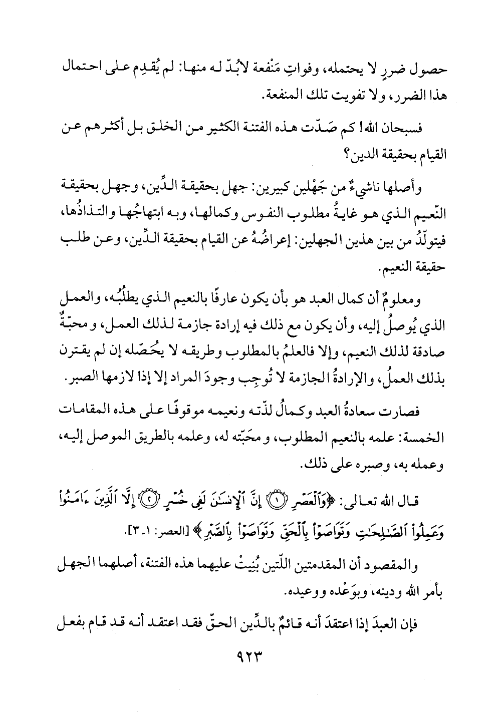 ومعلومٌ أن كمال العبد هو بأن يكون عارفًا بالنعيم الذي يطلُبُه، والعمل الذي يُوصلُ إليه، وأن يكون مع ذلك فيه إرادة جازمة لذلك العمل، ومحبّةٌ صادقة لذلك النعيم، وإلا فالعلمُ بالمطلوب وطريقه لا يُحَصّله إن لم يقترن بذلك العملُ، والإرادةُ الجازمة لا تُوجِب وجودَ المراد إلا إذا لازمها الصبر.