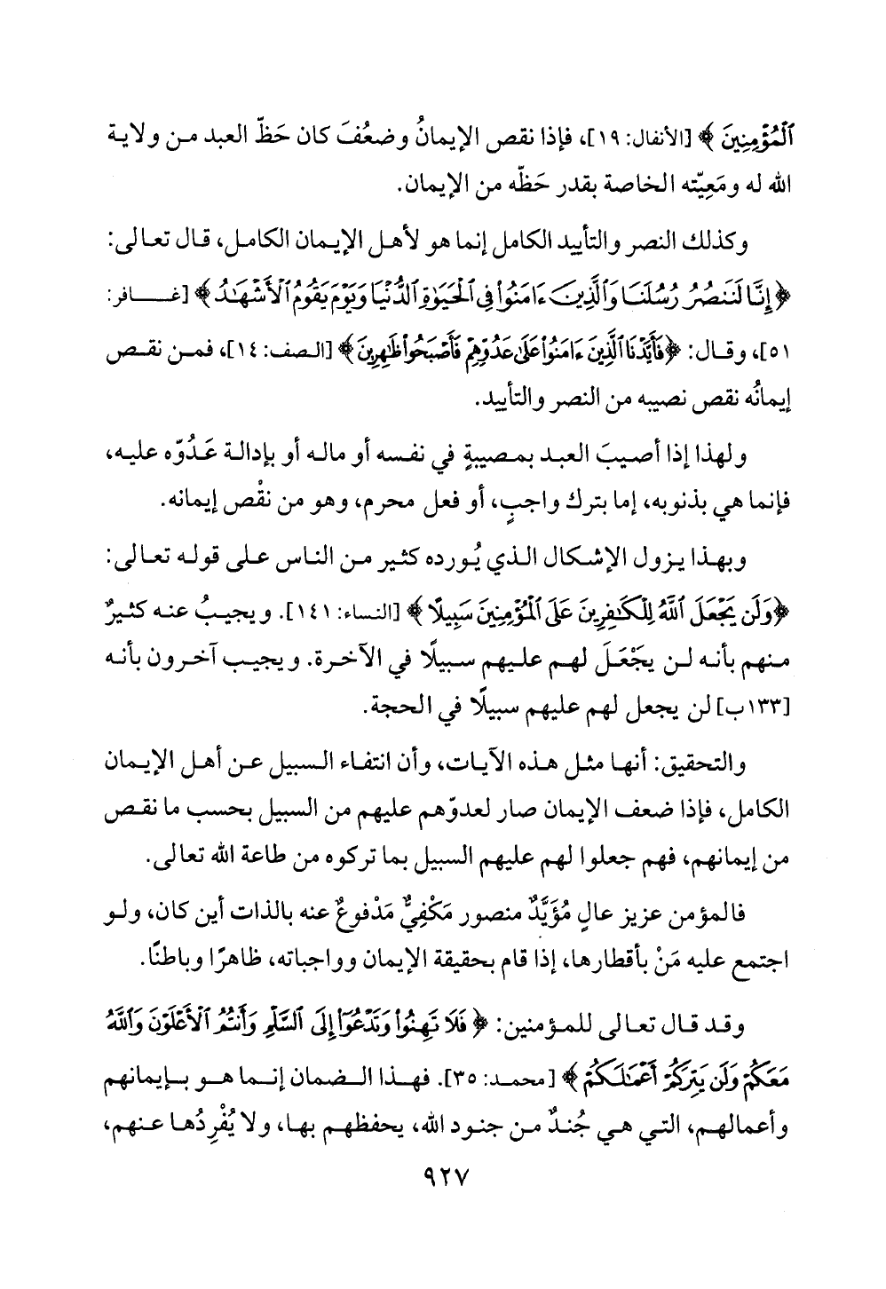 وكذلك النصر والتأييد الكامل إنما هو لأهل الإيمان الكامل، قال تعالى: {إِنَّا لَنَنْصُرُ رُسُلَنَا وَالَّذِينَ آمَنُوا فِي الْحَيَاةِ الدُّنْيَا وَيَوْمَ يَقُومُ الْأَشْهَادُ} [غافر: 51]، وقال: {فَأَيَّدْنَا الَّذِينَ آمَنُوا عَلَى عَدُوِّهِمْ فَأَصْبَحُوا ظَاهِرِينَ} [الصف: 14]، فمن نقص إيمانُه نقص نصيبه من النصر والتأييد.