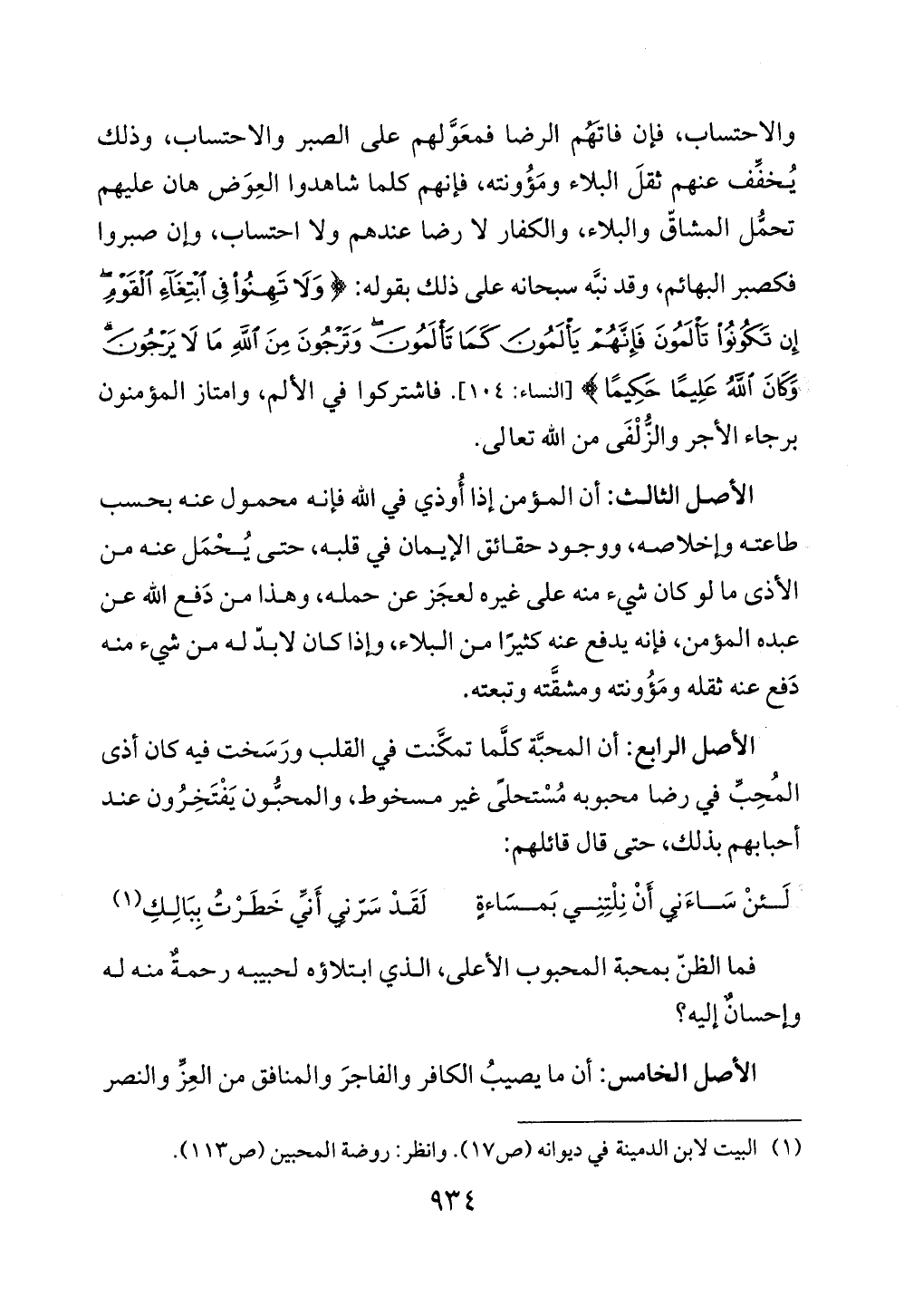 الأصل الرابع: أن المحبَّة كلَّما تمكَّنت في القلب ورَسَخت فيه كان أذى المُحِبِّ في رضا محبوبه مُسْتحلىً غير مسخوط، والمحبُّون يَفْتَخِرُون عند أحبابهم بذلك، حتى قال قائلهم: