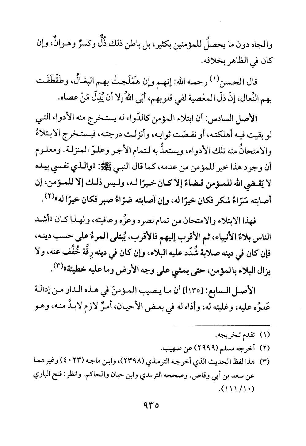 الأصل السادس: أن ابتلاء المؤمن كالدّواء له يستخرج منه الأدواء التي لو بقيت فيه أهلكته، أو نقصَت ثوابه، وأنزلت درجته، فيستخرج الابتلاءُ والامتحانُ منه تلك الأدواء، ويستعدُّ به لتمام الأجر وعلوّ المنزلة. ومعلوم أن وجود هذا خير للمؤمن من عدمه، كما قال النبي - صلى الله عليه وسلم -: "والذي نفسي بيده لا يَقضي الله للمؤمن قضاءً إلا كان خيرًا له، وليس ذلك إلا للمؤمن، إن أصابته سَرّاءُ شكر فكان خيرًا له، وإن أصابته ضرّاءُ صبر فكان خيرًا له" (¬2).