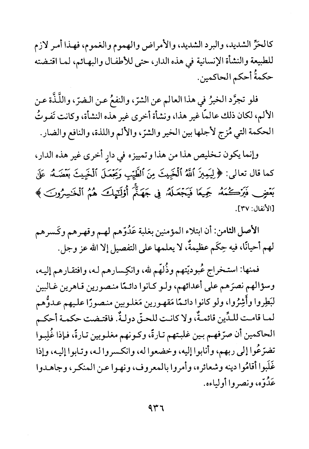 الأصل الثامن: أن ابتلاء المؤمنين بغلبة عَدُوّهم لهم وقهرهم وكَسرهم لهم أحيانًا، فيه حِكَم عظيمةٌ، لا يعلمها على التفصيل إلا الله عز وجل.