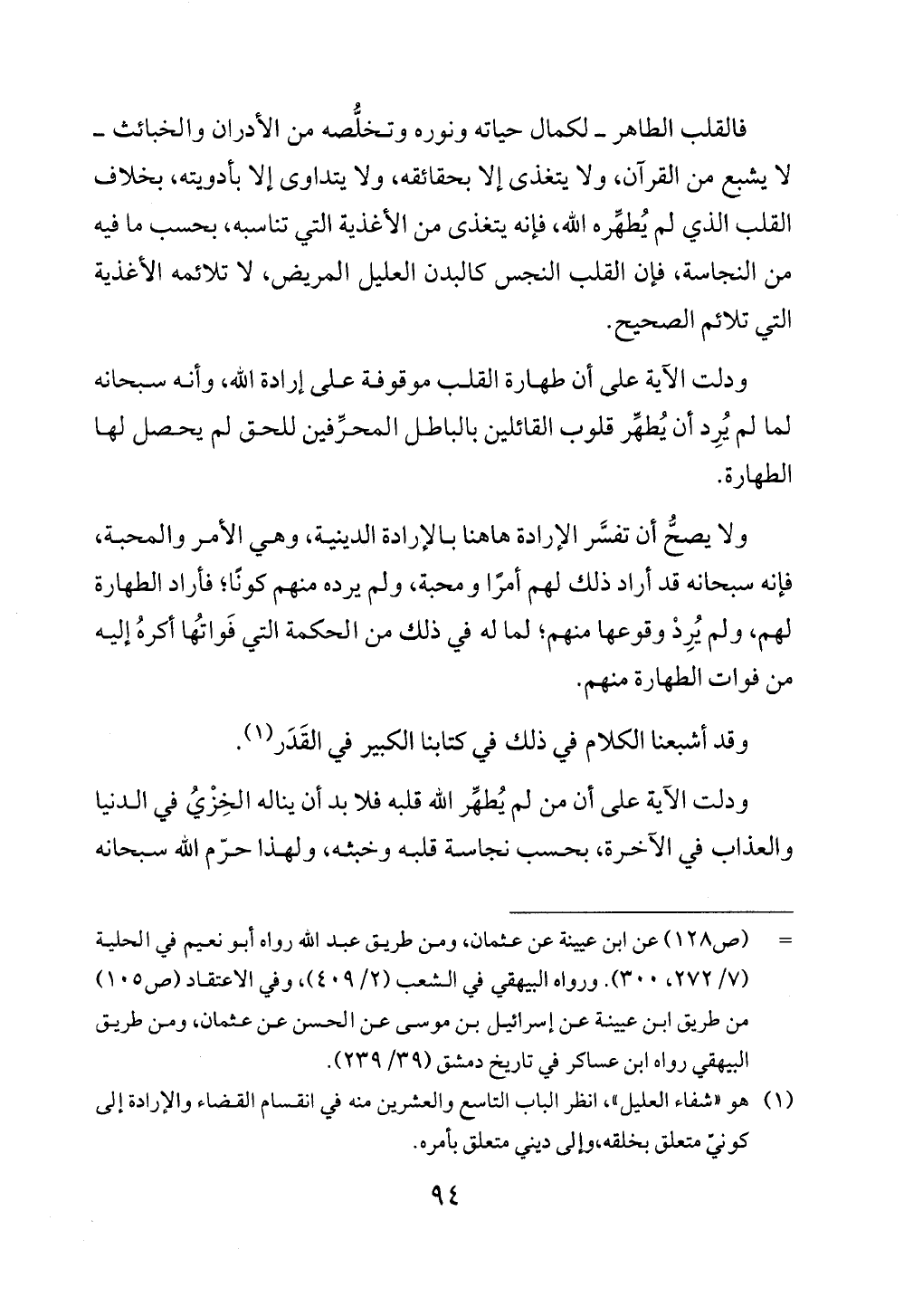 ودلت الآية على أن طهارة القلب موقوفة على إرادة الله، وأنه سبحانه لما لم يُرِد أن يُطهِّر قلوب القائلين بالباطل المحرِّفين للحق لم يحصل لها الطهارة.