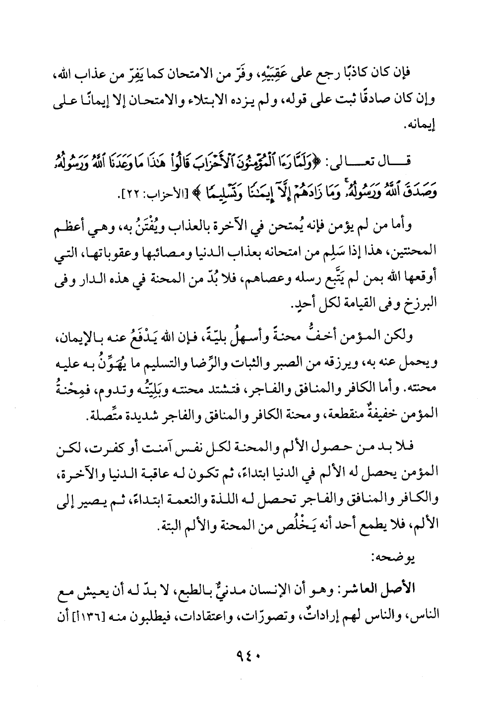 فلا بد من حصول الألم والمحنة لكل نفس آمنت أو كفرت، لكن المؤمن يحصل له الألم في الدنيا ابتداءً، ثم تكون له عاقبة الدنيا والآخرة، والكافر والمنافق والفاجر تحصل له اللذة والنعمة ابتداءً، ثم يصير إلى الألم، فلا يطمع أحد أنه يَخْلُص من المحنة والألم البتة.